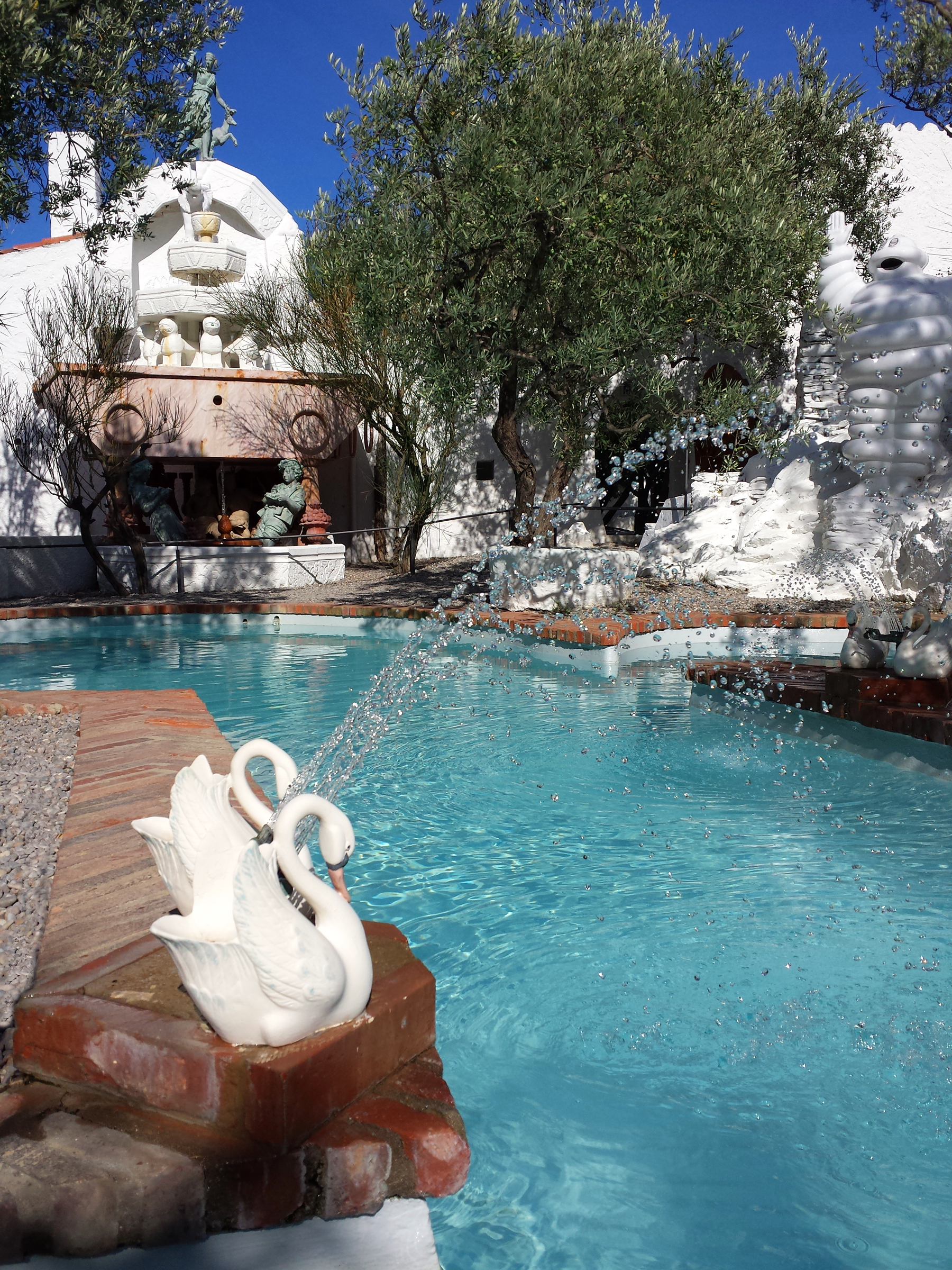 C’est en bordure de la « piscine » que se trouve le fameux canapé-lèvres en plastique rose, niché contre un mur décoré de pneus Pirelli, emblématique de Monsieur Dalí ! C’était pour moi la partie la plus émouvante de cette visite et j’y ai passé un long moment.