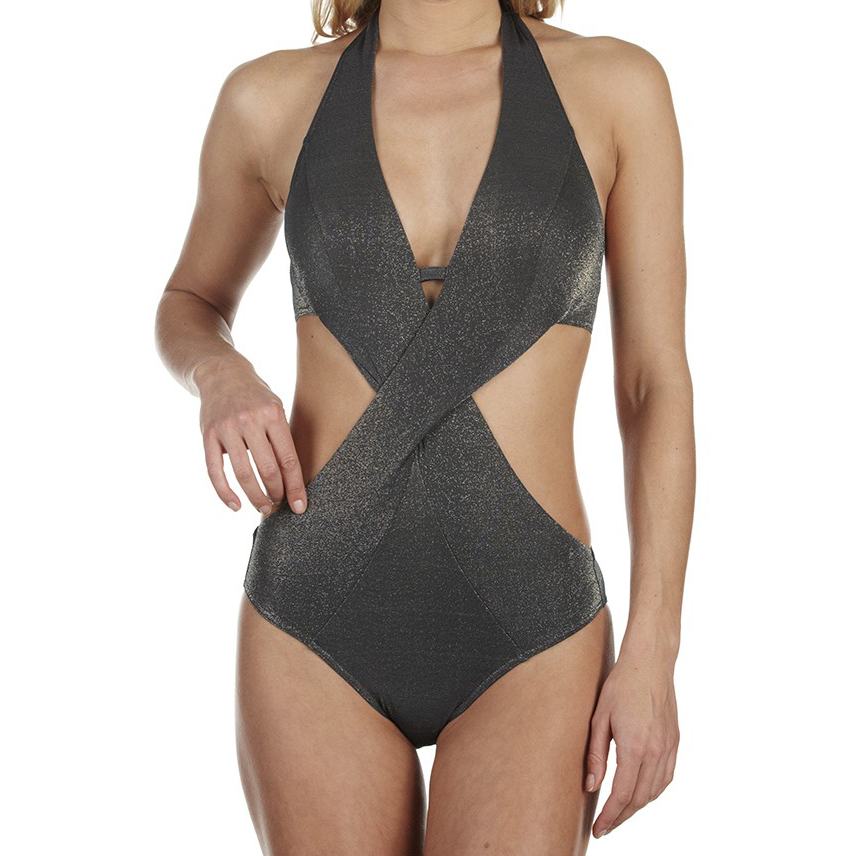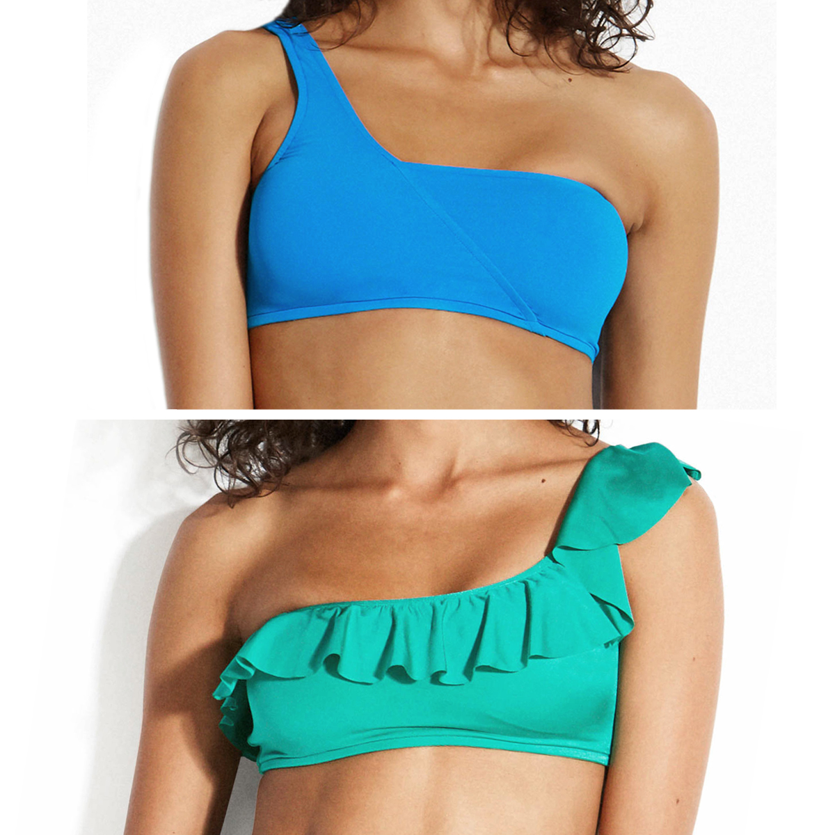 • Les maillots à découpes et bretelles asymétriques (one-shoulder, trikini) pour casser le volume des épaules.