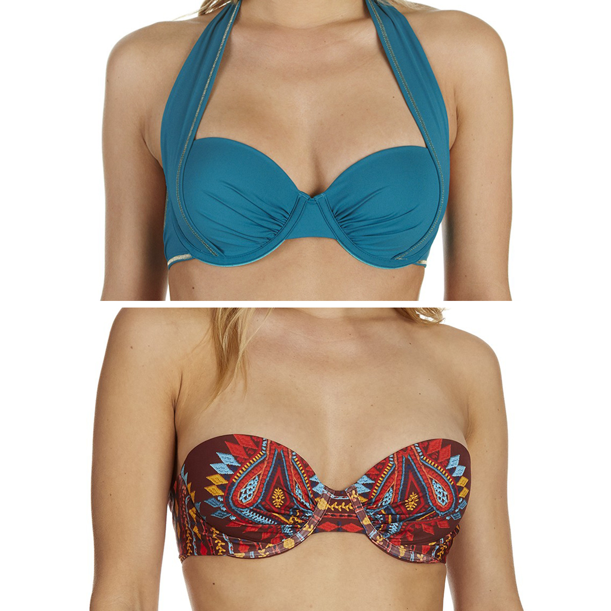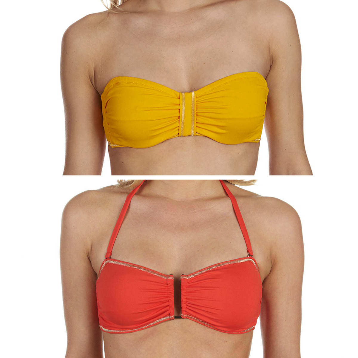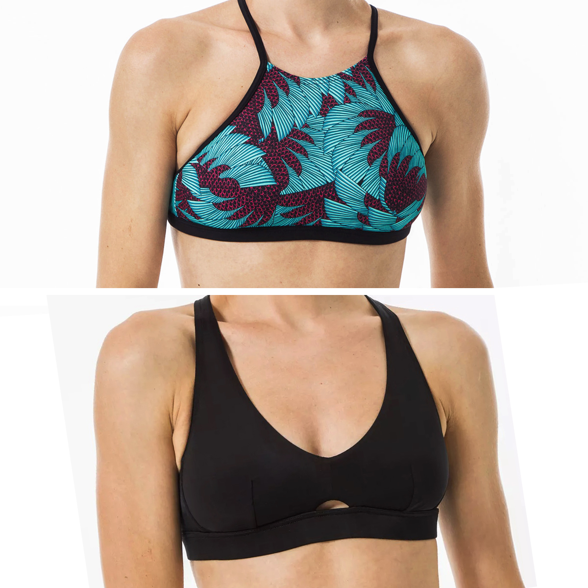 • Les décolletés carrés ou encolures montantes (brassière, tankini, halter top) qui augmentent la carrure.