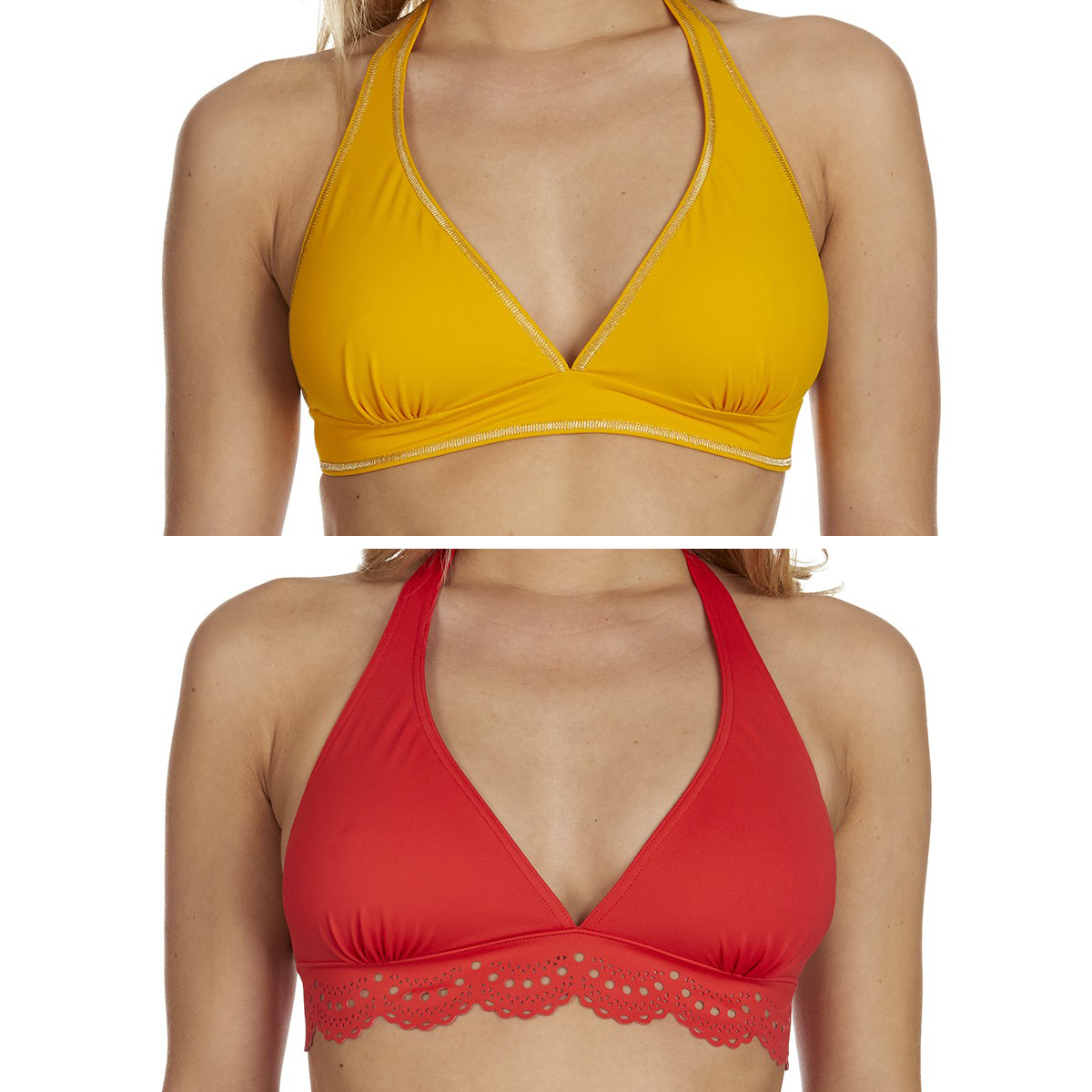 • Les hauts triangle, foulard, décolleté V, push-up ou balconnet, à bonnets rembourrés pour booster le volume des seins et noués sur la nuque pour adoucir la carrure.