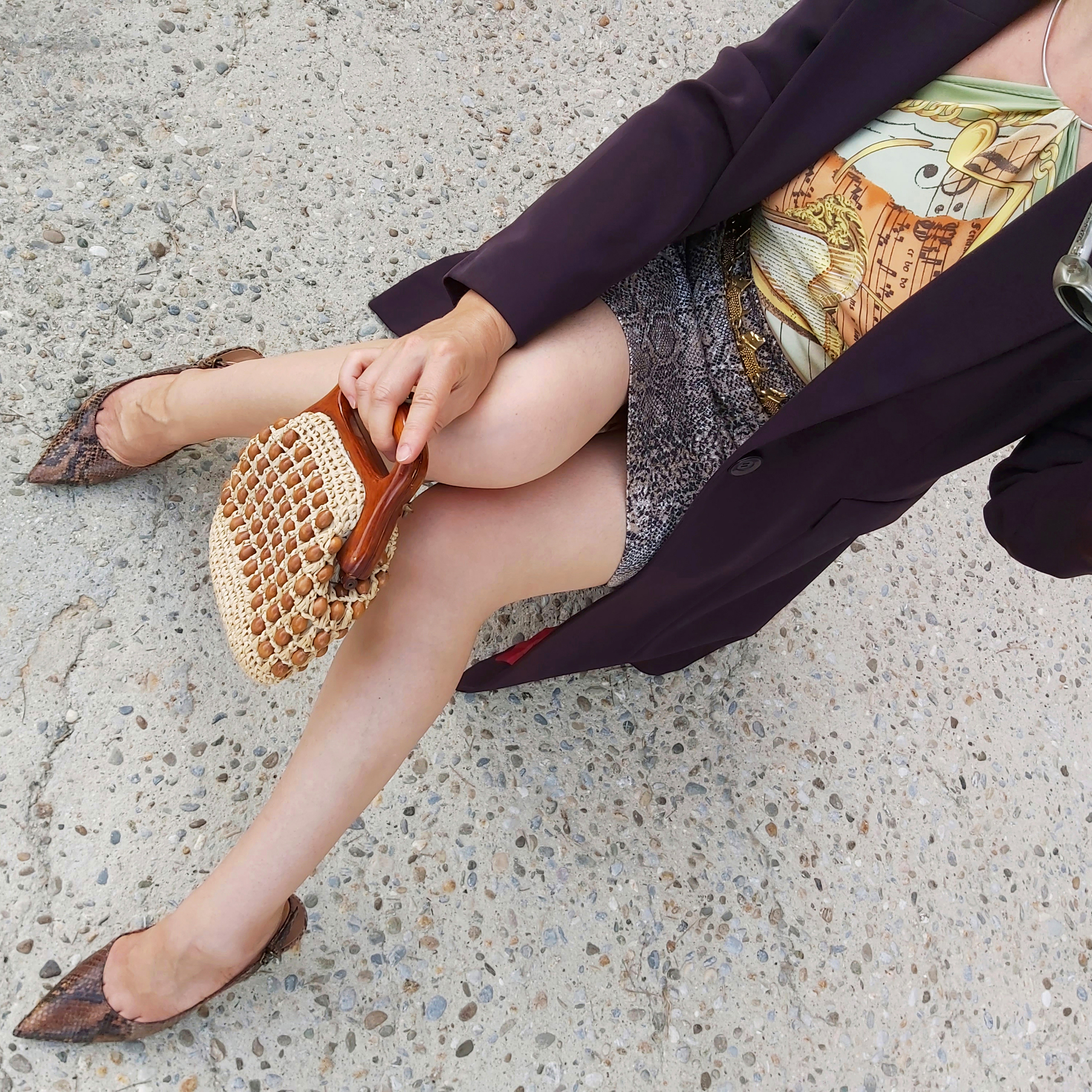 Les micros sacs perlés sont la grande tendance actuelle, il a donc tout pour plaire ! Enfin, son bois couleur noisette s’harmonise bien avec les tons cuivrés du foulard et l’imprimé serpent des escarpins slingbacks. Je dois vous avouer que j’ai acheté ces chaussures tout en cuir en vide-greniers pour 7,00€ seulement : ce sont des Cosmo Paris, jamais portées et encore avec le prix étiqueté de 139€ !