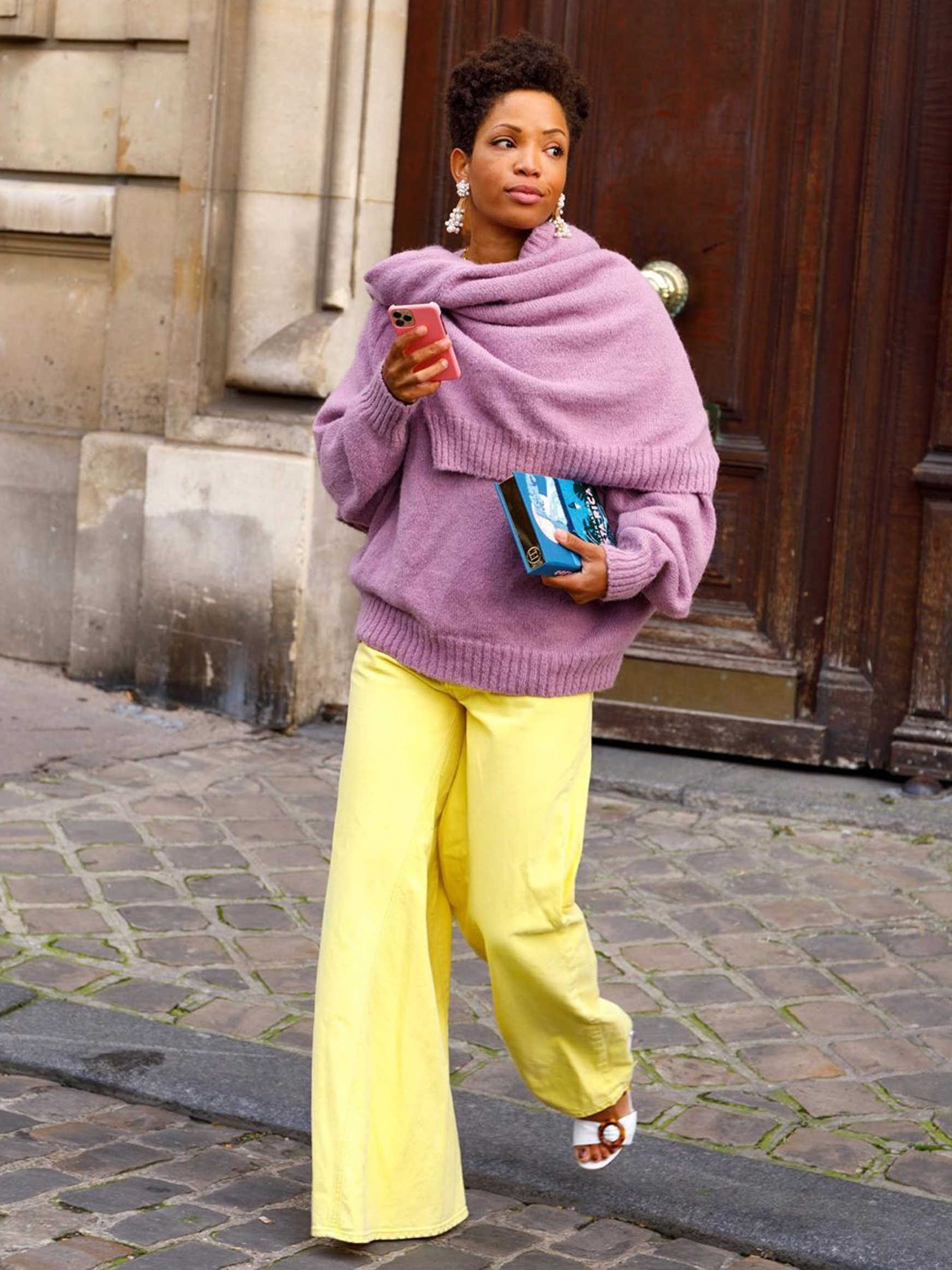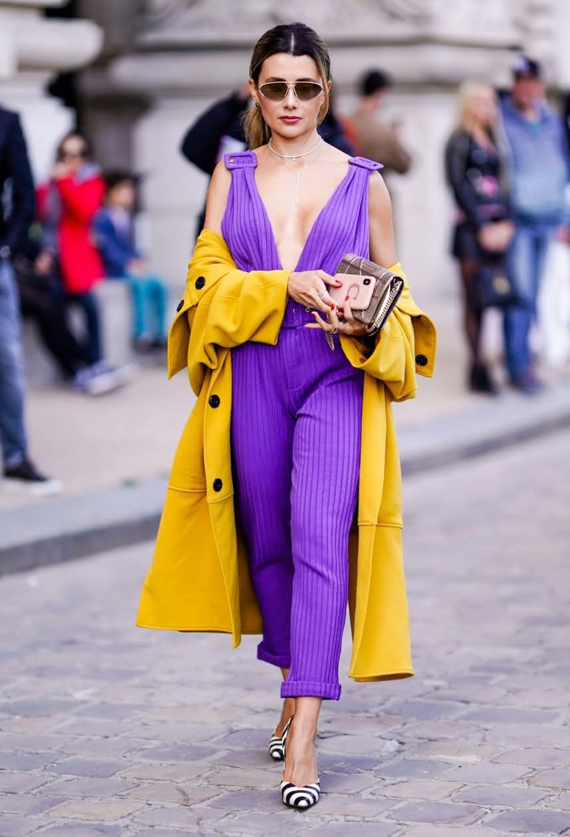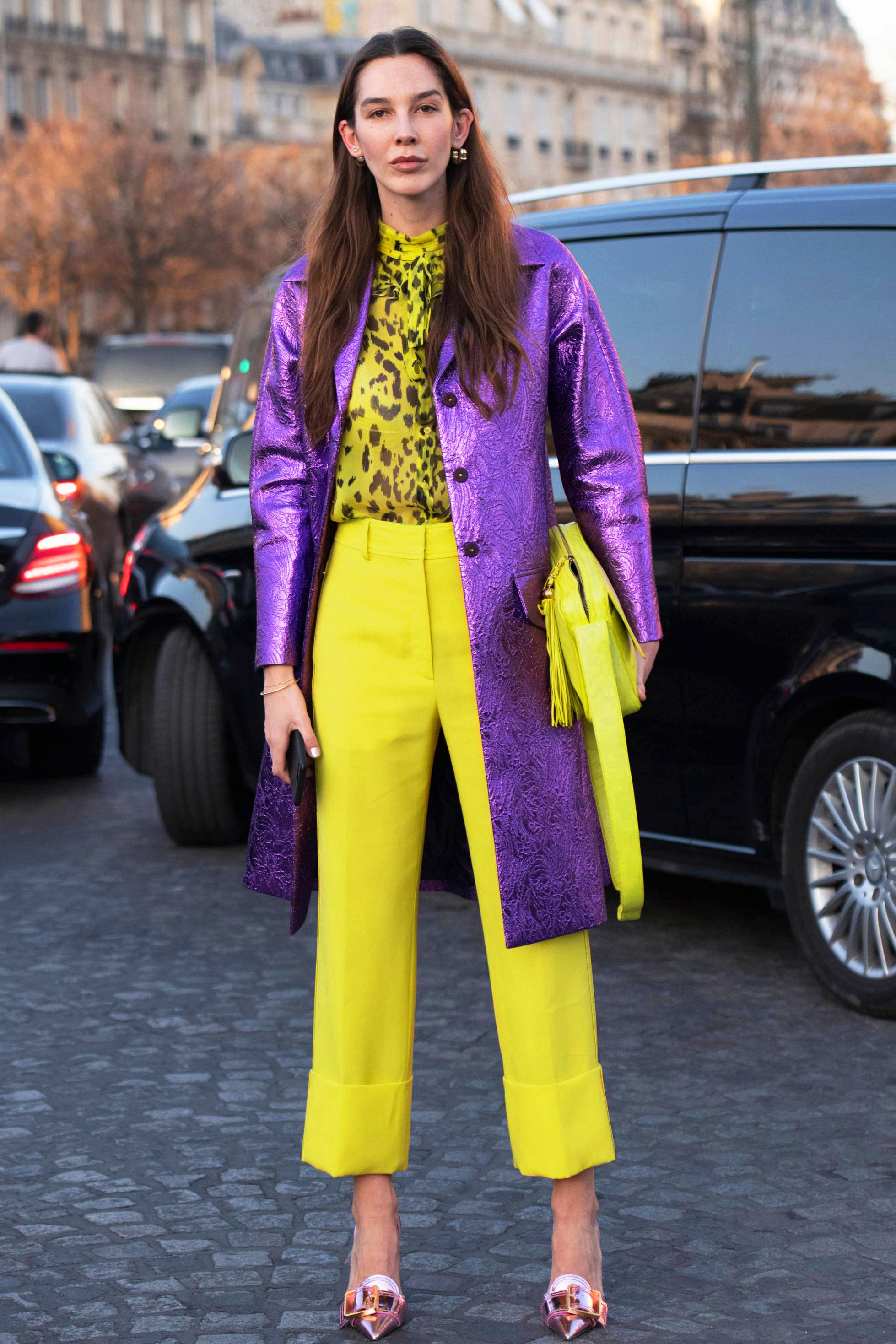 Cette harmonie consiste à associer deux couleurs directement opposées sur le cercle chromatique, à savoir une couleur primaire (jaune) avec une couleur secondaire (violet). L’harmonie complémentaire est considérée comme apportant l’équilibre idéal car elle comporte toujours une couleur chaude (jaune) et une couleur froide (violet), mais l’une doit être dominante par rapport à l’autre. Ici, le tailleur-pantalon jaune représente deux tiers de la tenue complète, le violet un tiers.