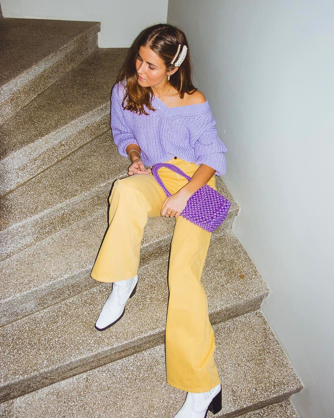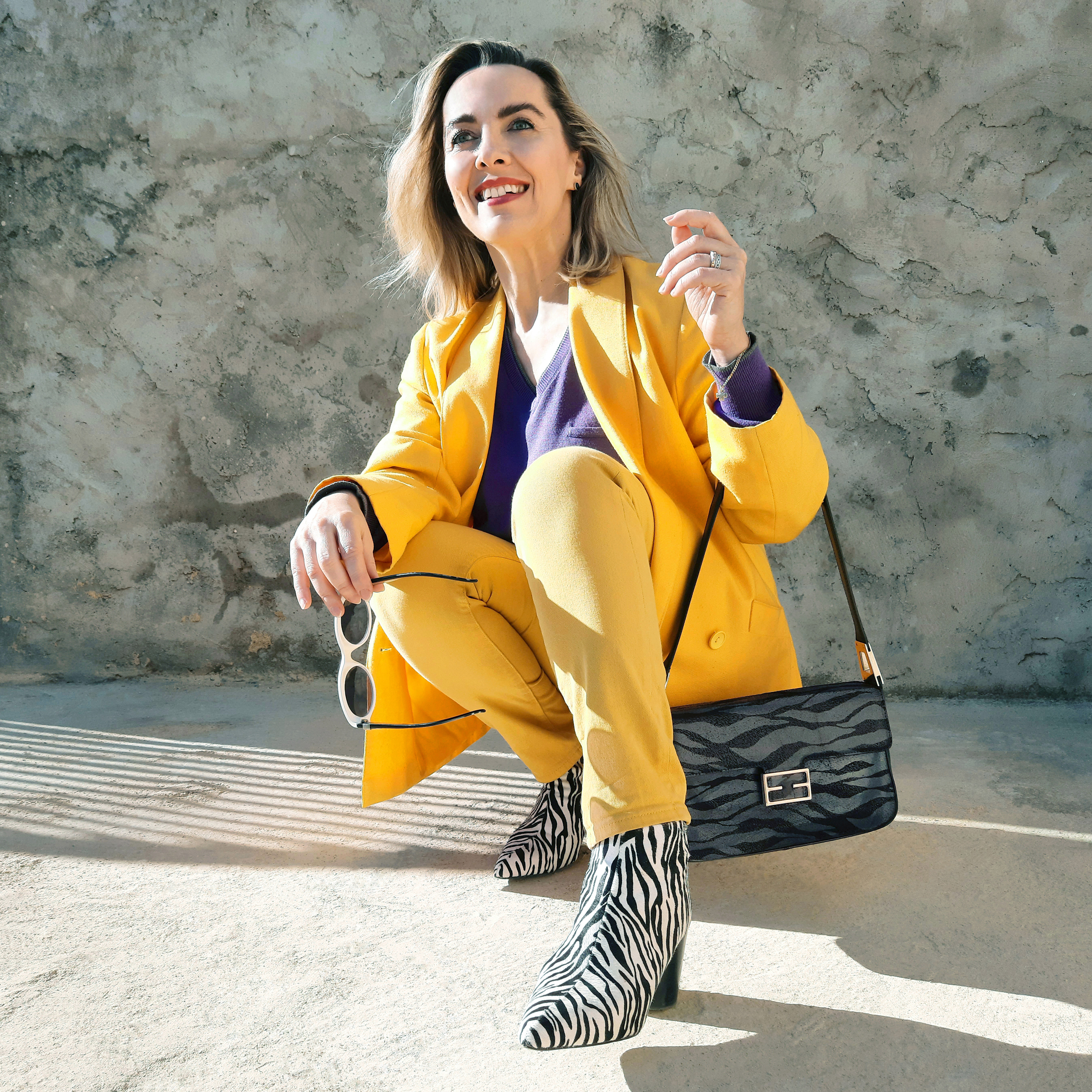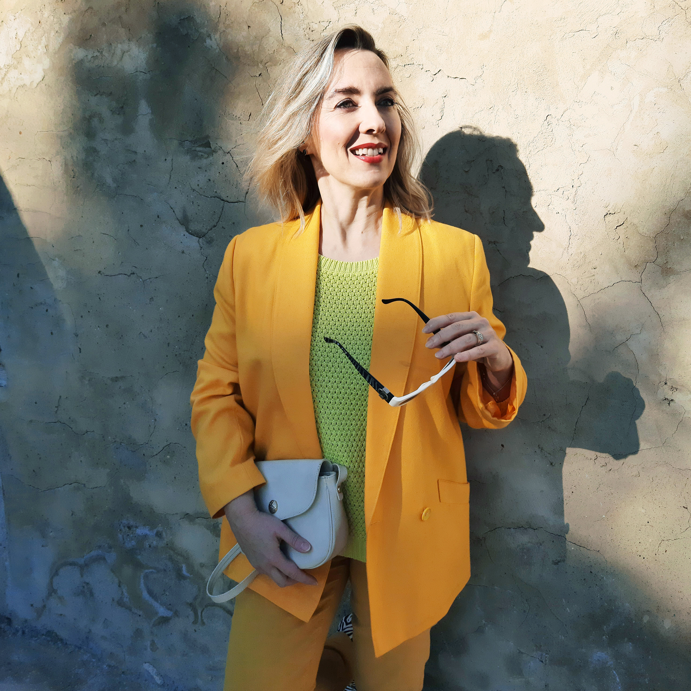 Du coup, mon ensemble veste et pantalon n’est pas incongru et constitue une bonne base pour un look de mi-saison. Et puisque c’est le printemps, j’ai choisi une harmonie en jaune : une couleur solaire et stimulante, pleine de luminosité et de peps. Je ne pensais pas être une grande fan de jaune, mais je me suis rendue compte que je composais régulièrement des looks dans cette couleur. 💛