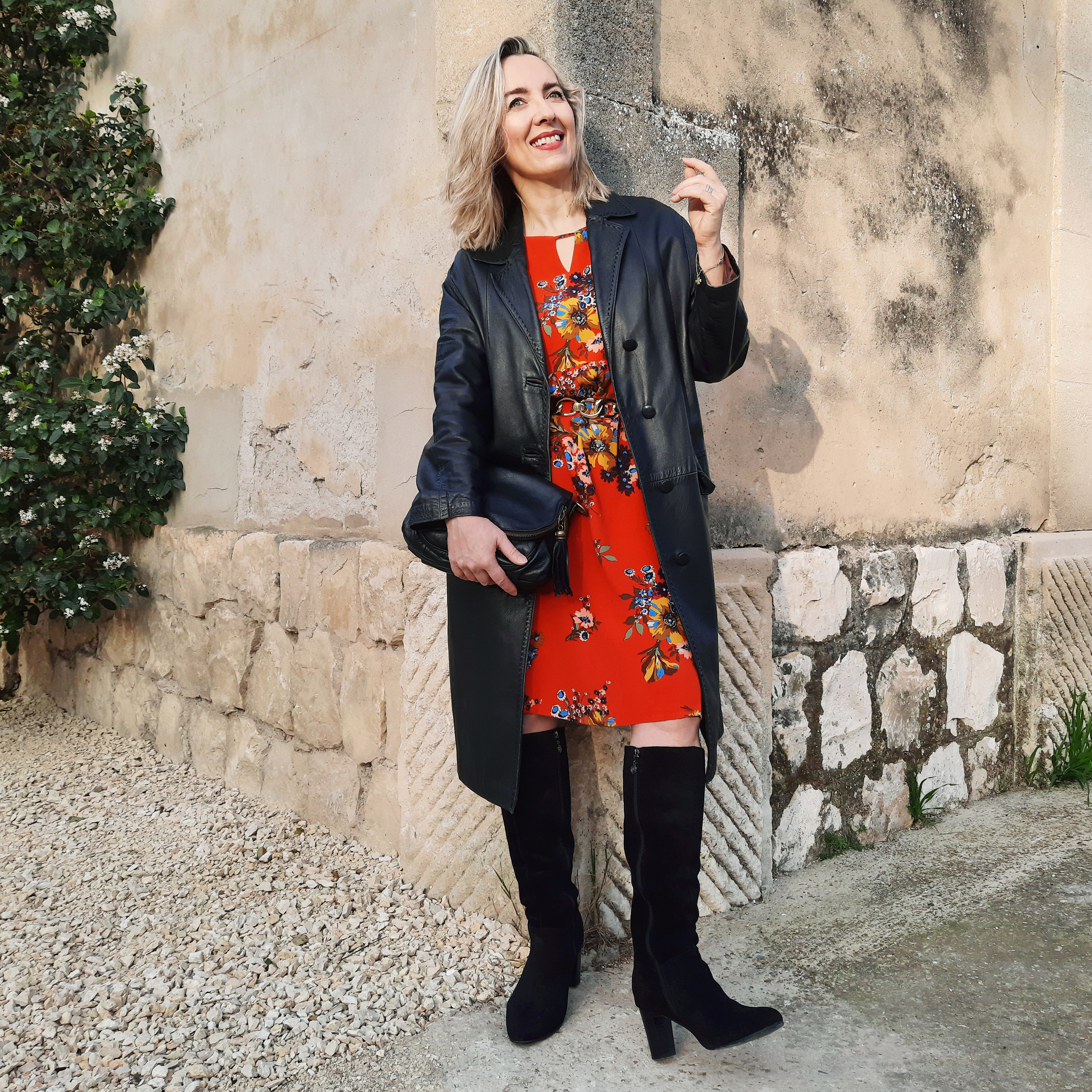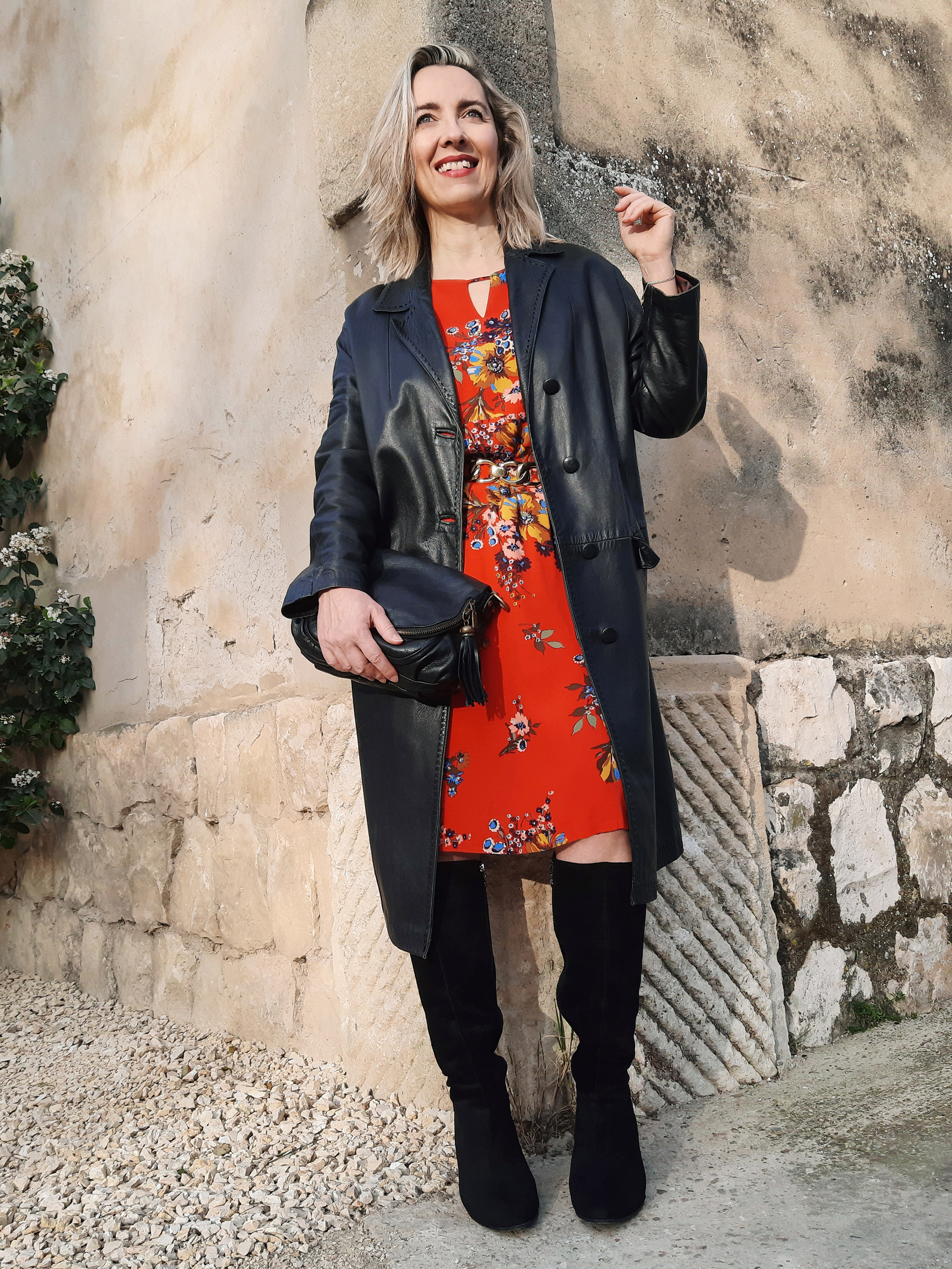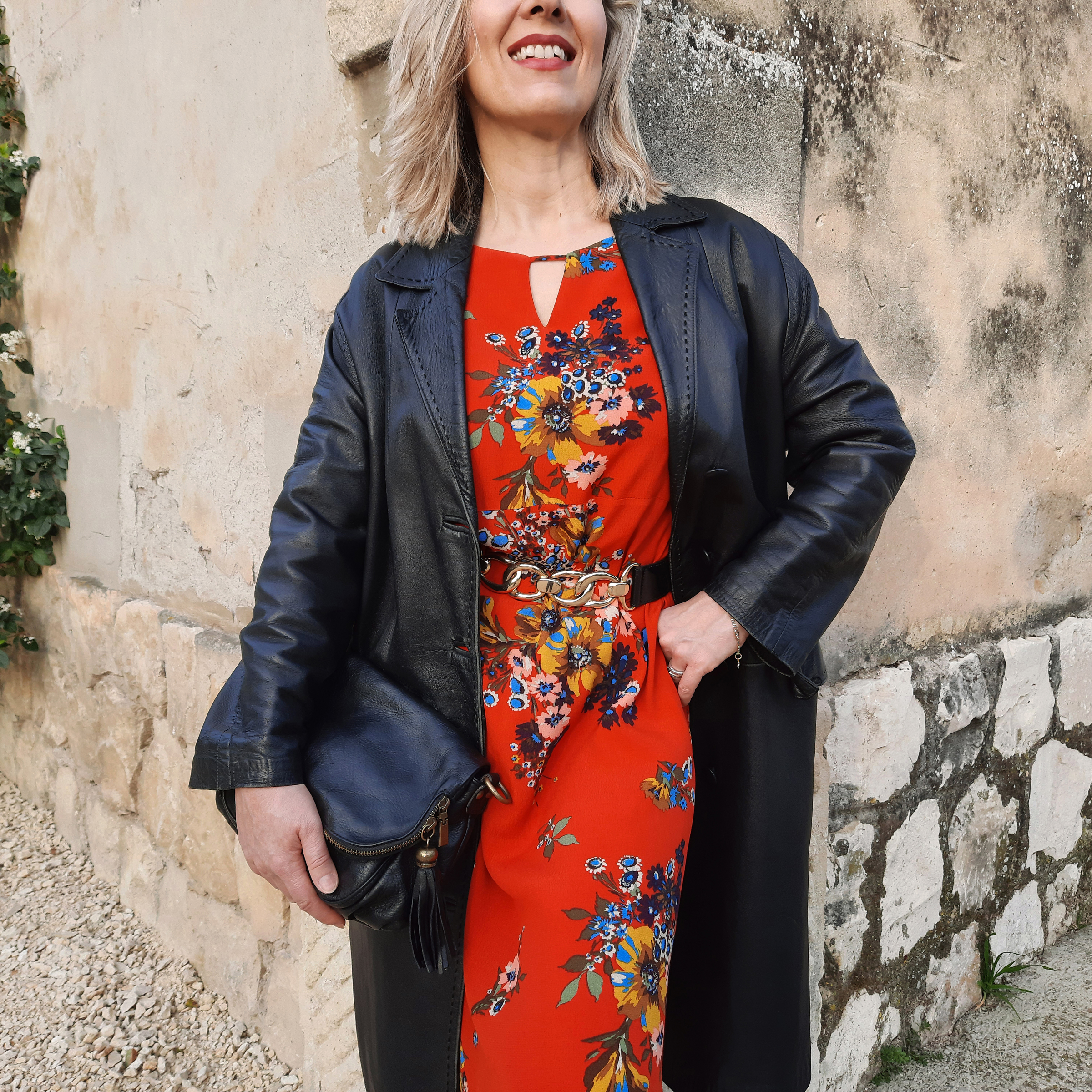 On n’associe pas habituellement l’imprimé fleuri – d’inspiration bohème ou romantique – et le cuir (un des codes du style rock) mais j’ai tenté l’expérience avec ce look bicolore à base de noir et orange paprika. Le résultat intense et contrasté, un brin rétro, est à mi-chemin entre les années 70 et 90. J’ai chiné le manteau en cuir vintage connoté Y2K chez Emmaüs, un incontournable de la saison en version mi-longue ou maxi. Je suis fan de son aspect patiné et de sa couture surpiquée qui court tout le long du col et du boutonnage !