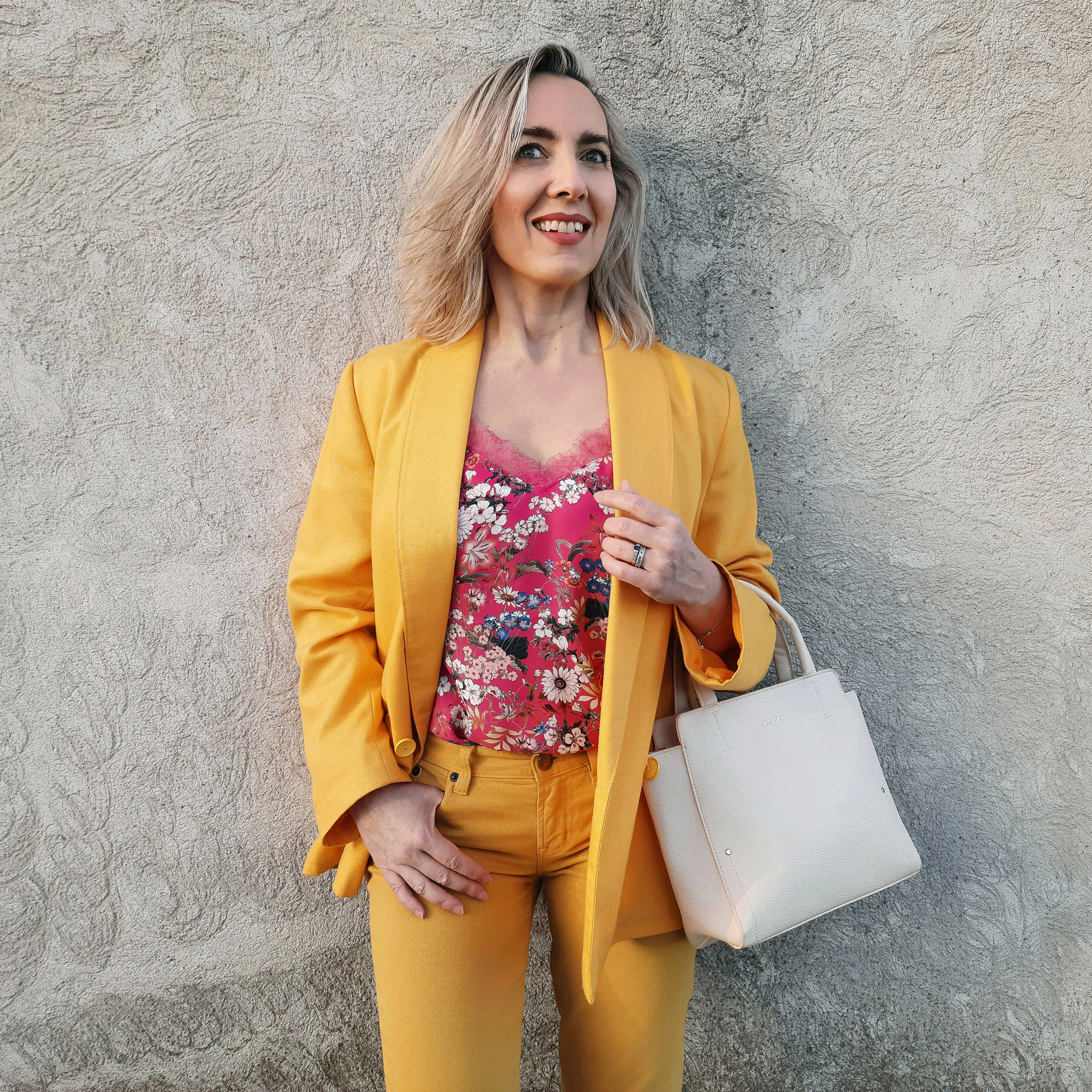 J’ai acheté cette veste en vide-greniers et elle m’a vraiment séduite avec sa coupe oversize et son coloris jaune soleil, me rappelant certains modèles de Jacquemus dont j’adore le style. Dans cette tenue, j’ai assemblé plusieurs tendances phares de ce printemps : le jaune qui est LA couleur incontournable de la saison (d’ailleurs élue couleur Pantone de l’année 2021), le rose (à décliner dans toutes les nuances des pastel aux plus vives), l’imprimé floral (du mini motif aux maxi fleurs) et le tailleur pantalon coordonné (de préférence d’allure minimaliste, inspiré des années 90).