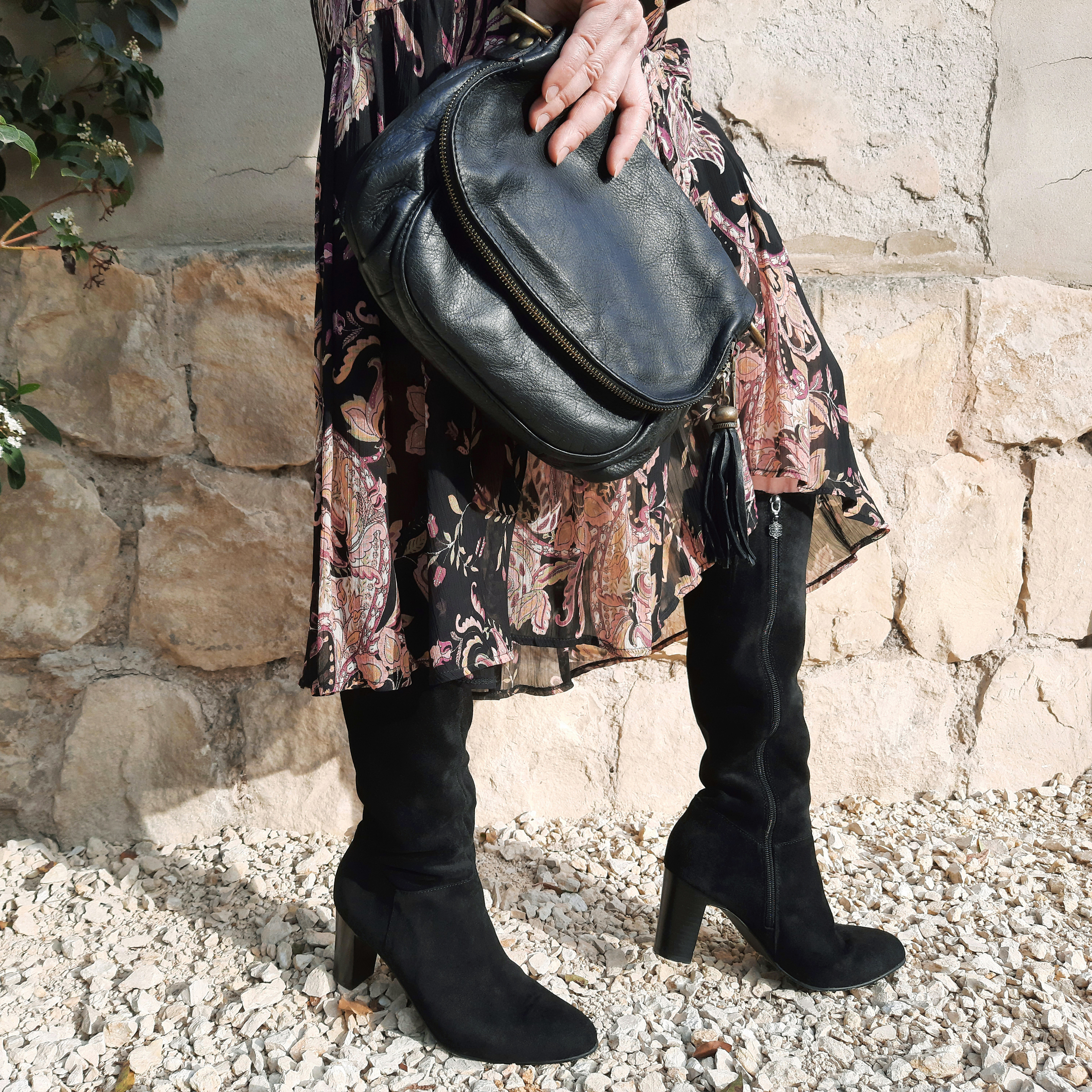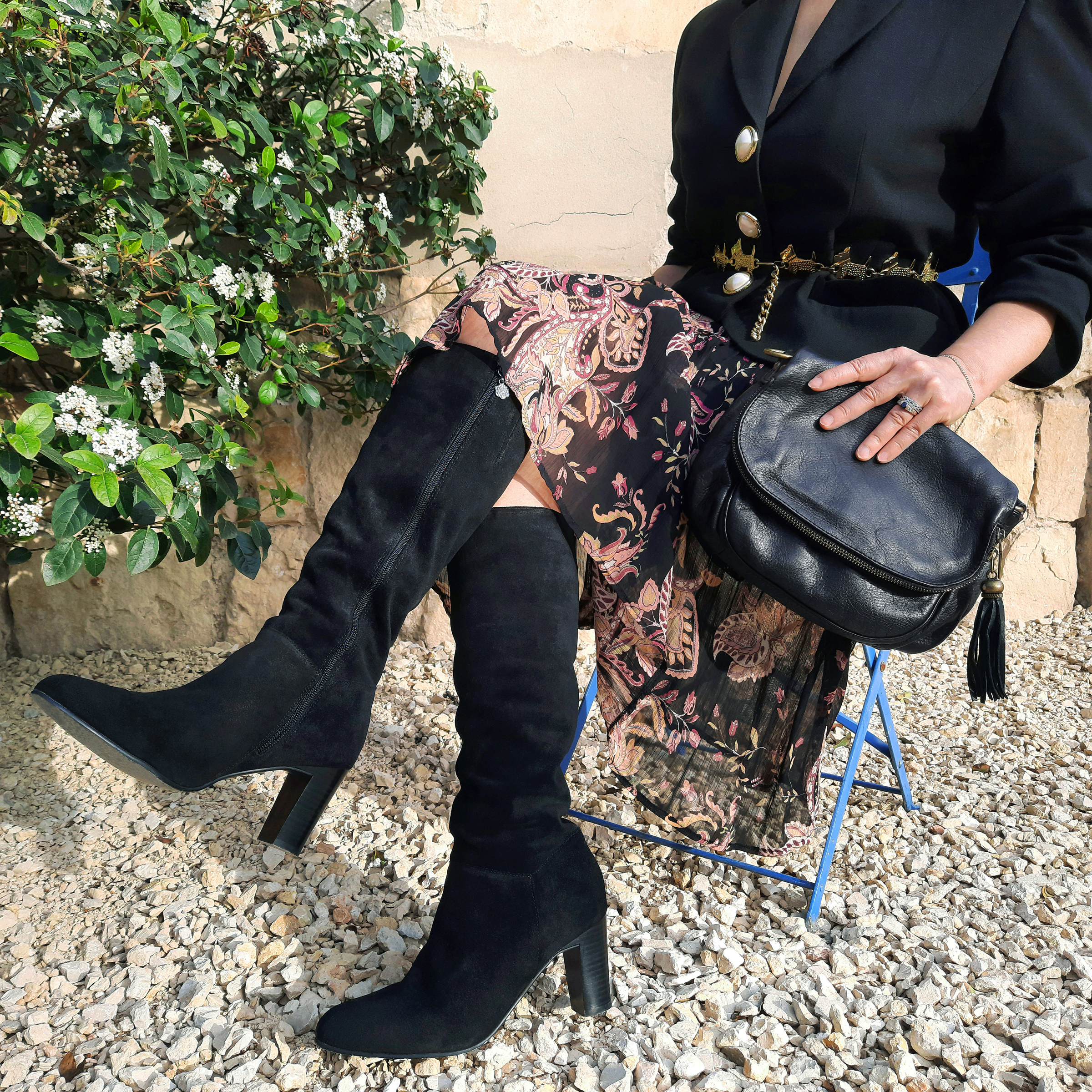 Lorsque vous composez un total look noir, jouez sur différentes matières et textures (mat/brillant, lisse/rugueux, soyeux/velouté) pour un rendu visuellement plus intéressant. Les bottes hautes en daim font écho aux détails en velours noir mat de la veste, et j’ai apporté une touche de brillance dans cette tenue sombre grâce à la ceinture chaîne en métal doré et à la pochette en cuir patiné.