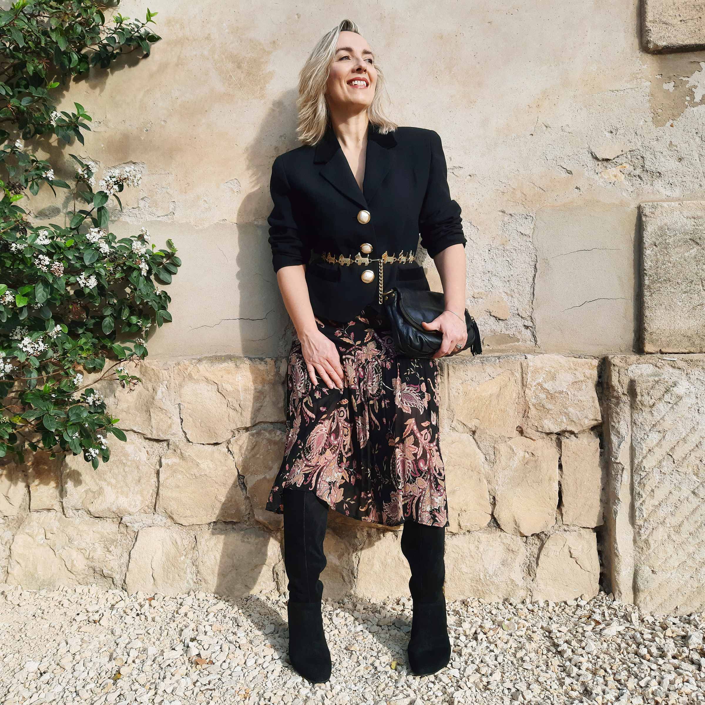 J’ai eu un vrai coup de cœur pour l’imprimé de cette jupe longueur midi en voile semi-transparent : un mélange de motifs floraux, végétaux et cachemire dans des tons doux de vieux rose, beige et vert tendre qui lui donne un petit côté bohème chic. Je l’ai achetée il y a une dizaine d’années mais je l’aime toujours autant ! La veste vintage Verdosa Paris est un modèle classique intemporel fabriqué en France, avec des maxi épaulettes caractéristiques des années 80-90 qui apportent cette carrure de working girl en vogue à l’époque.