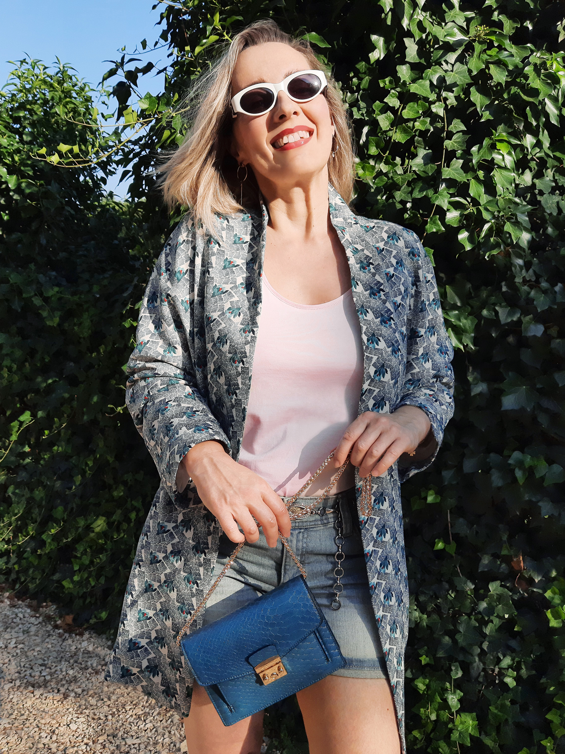 L’imprimé délicat mélange des fleurs stylisées et des motifs graphiques comme dessinés à l’encre qui m’évoquent les estampes japonaises. L’aspect denim bleached du short se marie parfaitement avec les tonalités bleu-gris de la veste, rehaussées par les petites touches de rouge et de gris-vert. Pour les accessoires, j’ai privilégié des tons froids avec les sandales argentées et la ceinture chaîne en métal vieilli (achetées chacune un euro seulement en vide-greniers !).