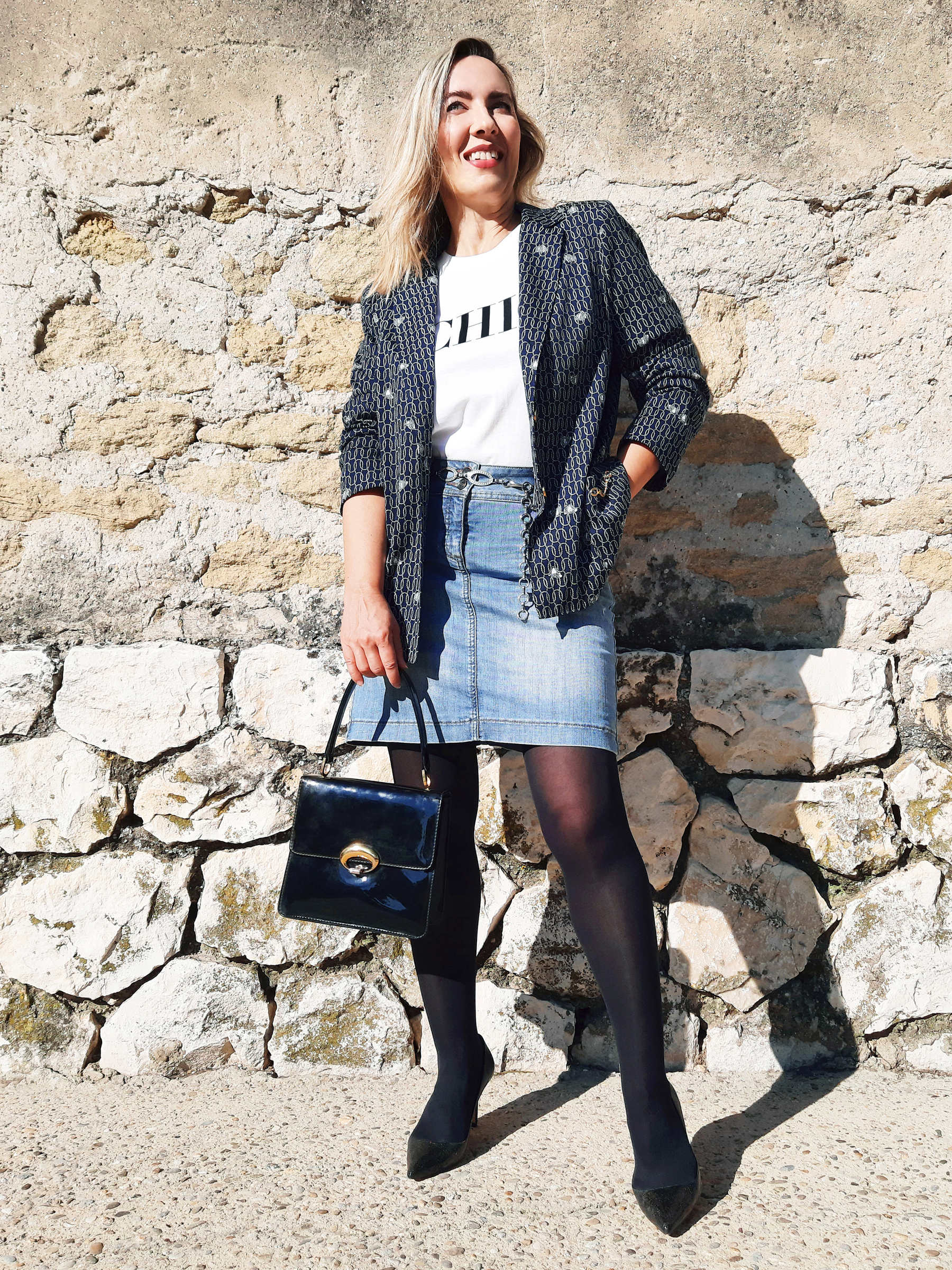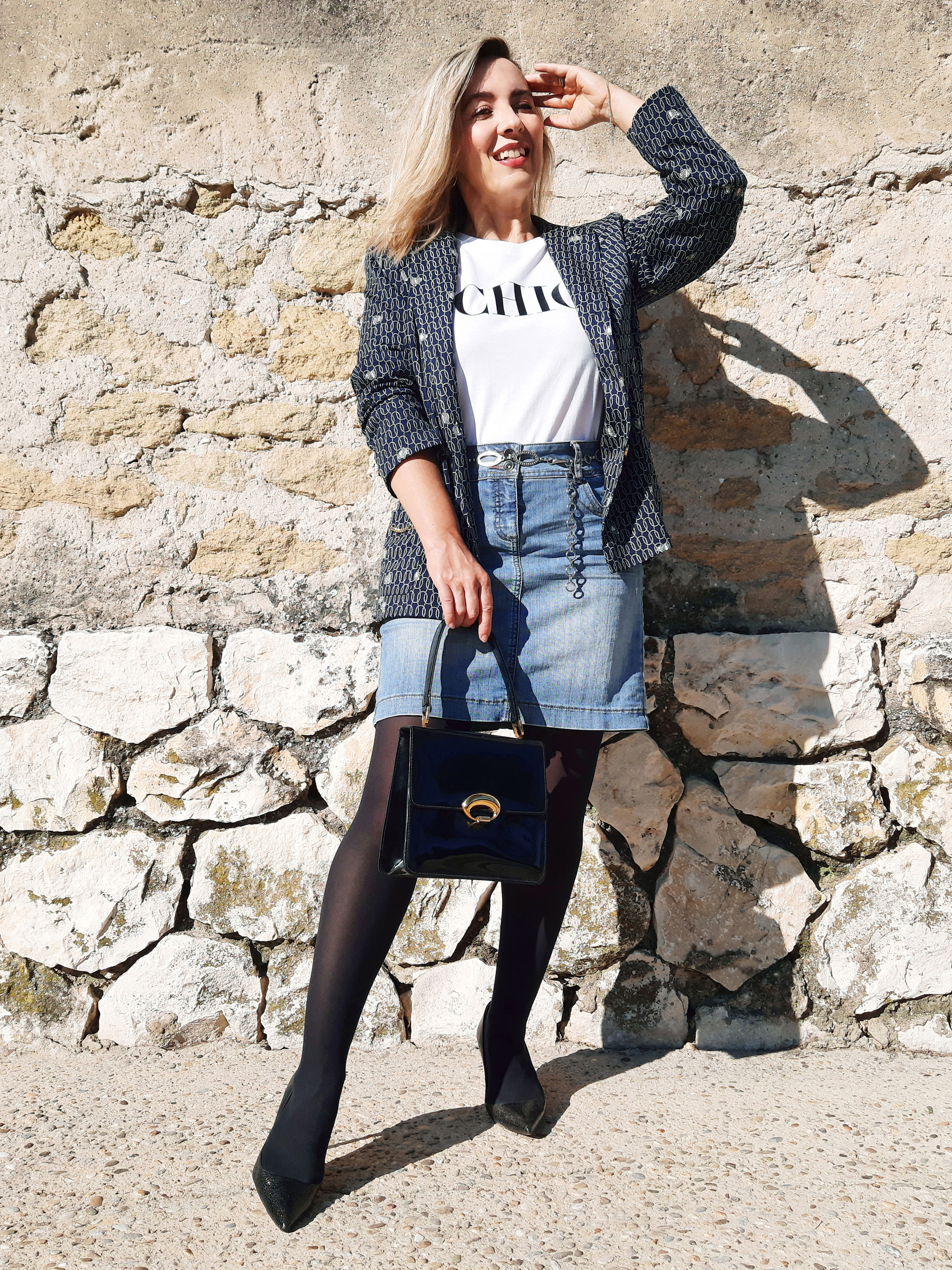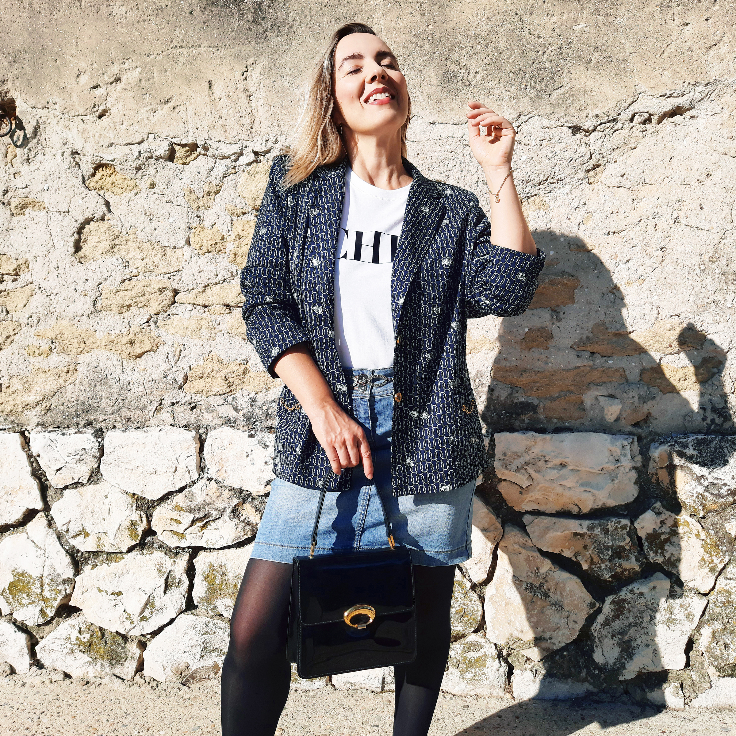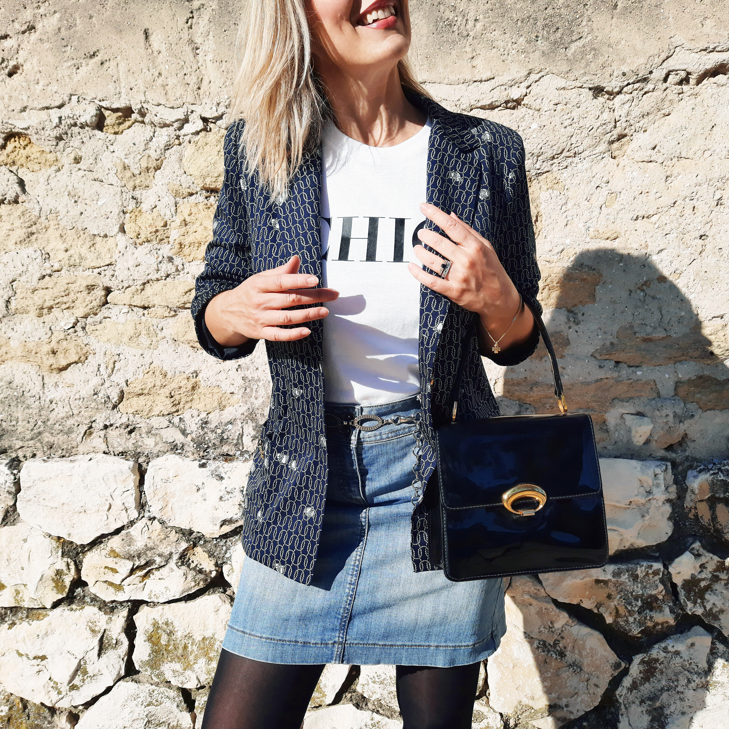 N’ayant pas de marinière dans ma garde-robe, j’ai gardé une palette bicolore de bleu et blanc pour prolonger le thème nautique. Comme j’aime mélanger les pièces vintage et actuelles, j’ai choisi de décaler mon blazer avec un tee-shirt blanc et une mini-jupe en denim, qui sont aussi des basiques. Ce mix crée un style unique et donne à mon look un rendu casual chic plus moderne.