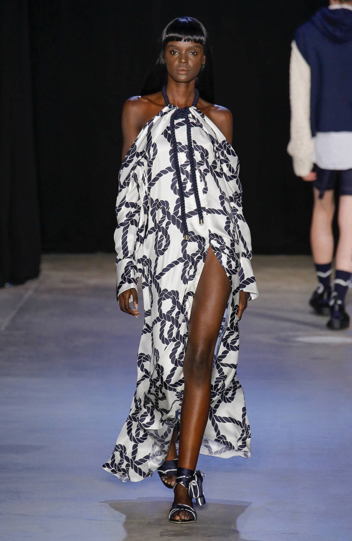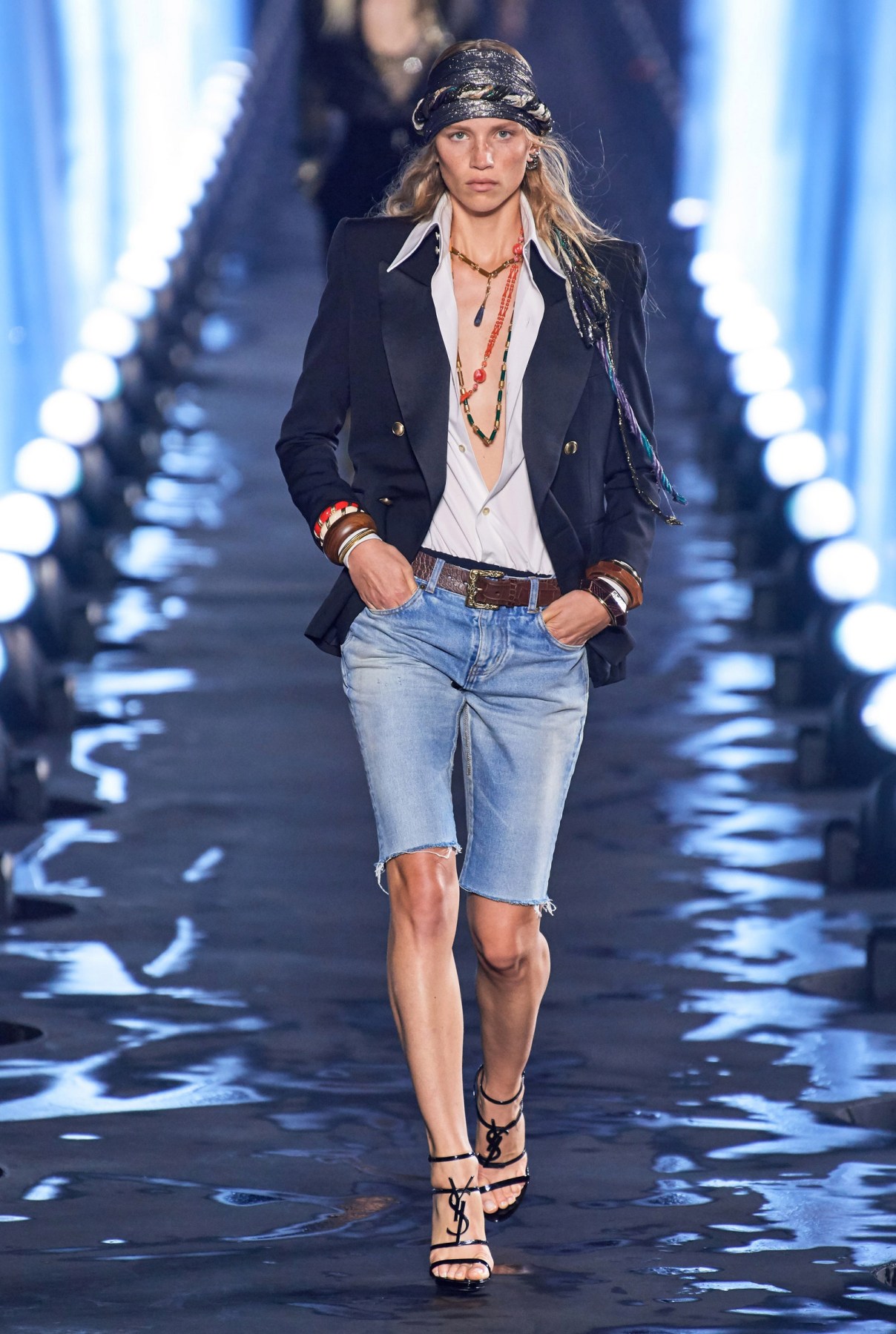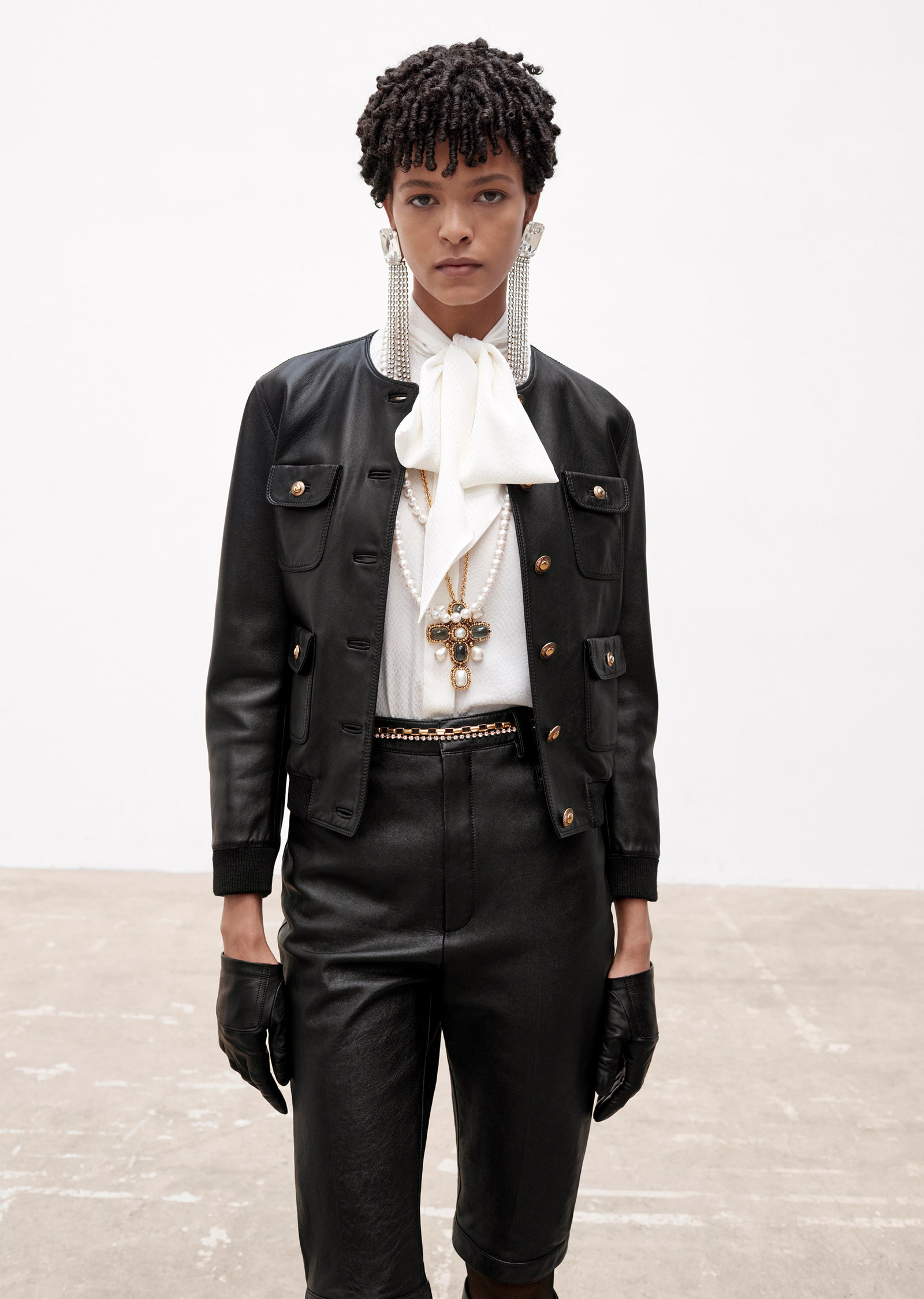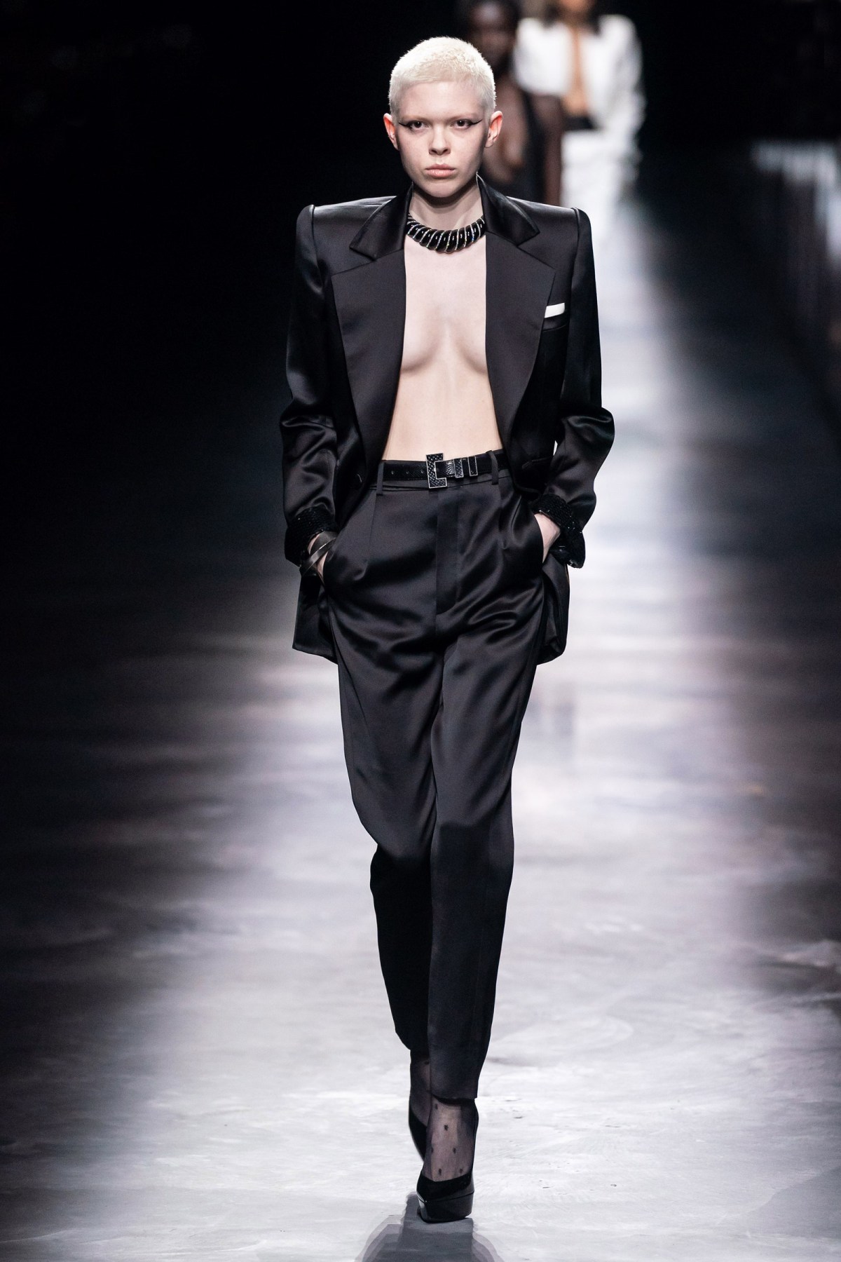 Cette seconde tenue trouve son inspiration dans le style intemporel de Saint Laurent qui privilégie les looks bicolores ou monochromes, le plus souvent en total look noir, jouant sur le contraste entre matières raffinées (satin, velours, taffetas, brocart) et matières plus bling-bling (cuir, vinyle, latex). Sa quête d’une silhouette androgyne s’appuie sur un style masculin-féminin revendiqué depuis les années 70 – avec des pièces iconiques comme la saharienne, le tailleur pantalon et le smoking empruntés au vestiaire masculin qui révolutionnèrent la mode féminine – où ses créations allient minimalisme et sophistication extrême.