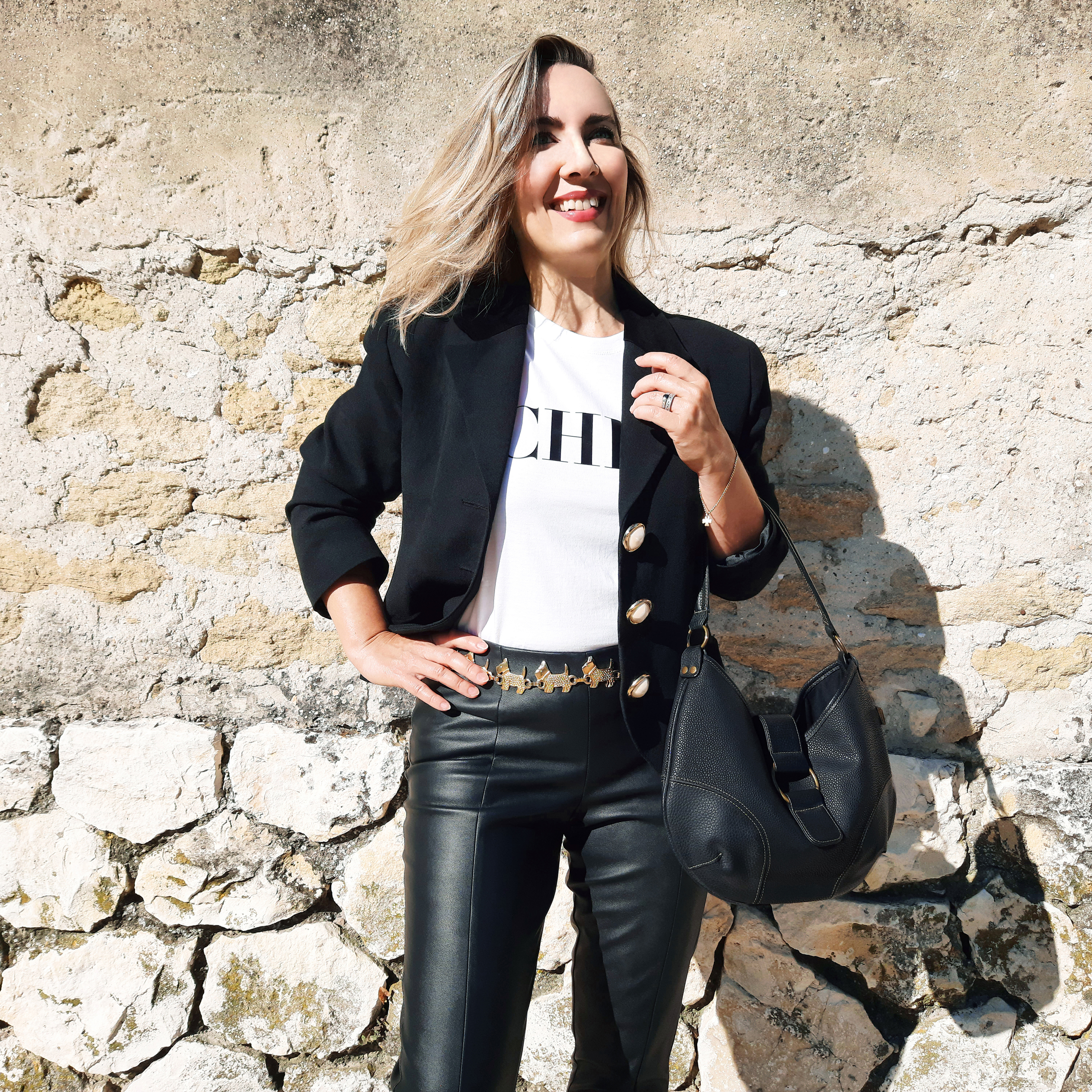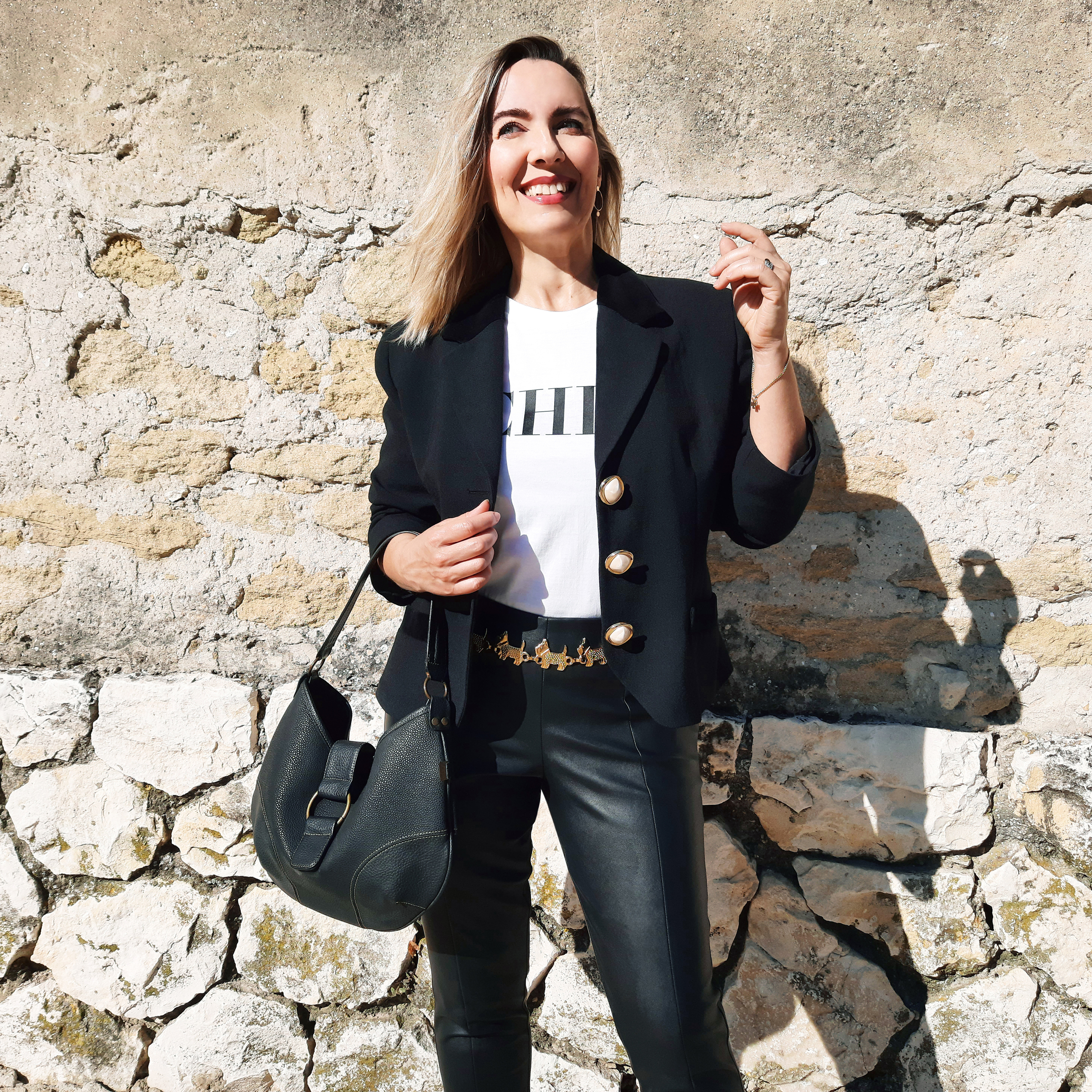 Ma veste vintage Verdosa Paris en mélange laine/polyester est une pièce « habillée » dont l’élégance est accentuée par ses trois gros boutons perlés et les détails en velours au col et sur les poches; je l’ai associée à un tregging en simili cuir d’allure urbaine pour un contraste des styles entre chic parisien et streetwear. Si vous mixez plusieurs pièces noires, je vous conseille de jouer sur des textures différentes pour apporter du relief à votre tenue : ici, on a du mat (veste, tee-shirt), du satiné (pantalon) et du grainé avec le sac baguette en cuir effet galuchat.