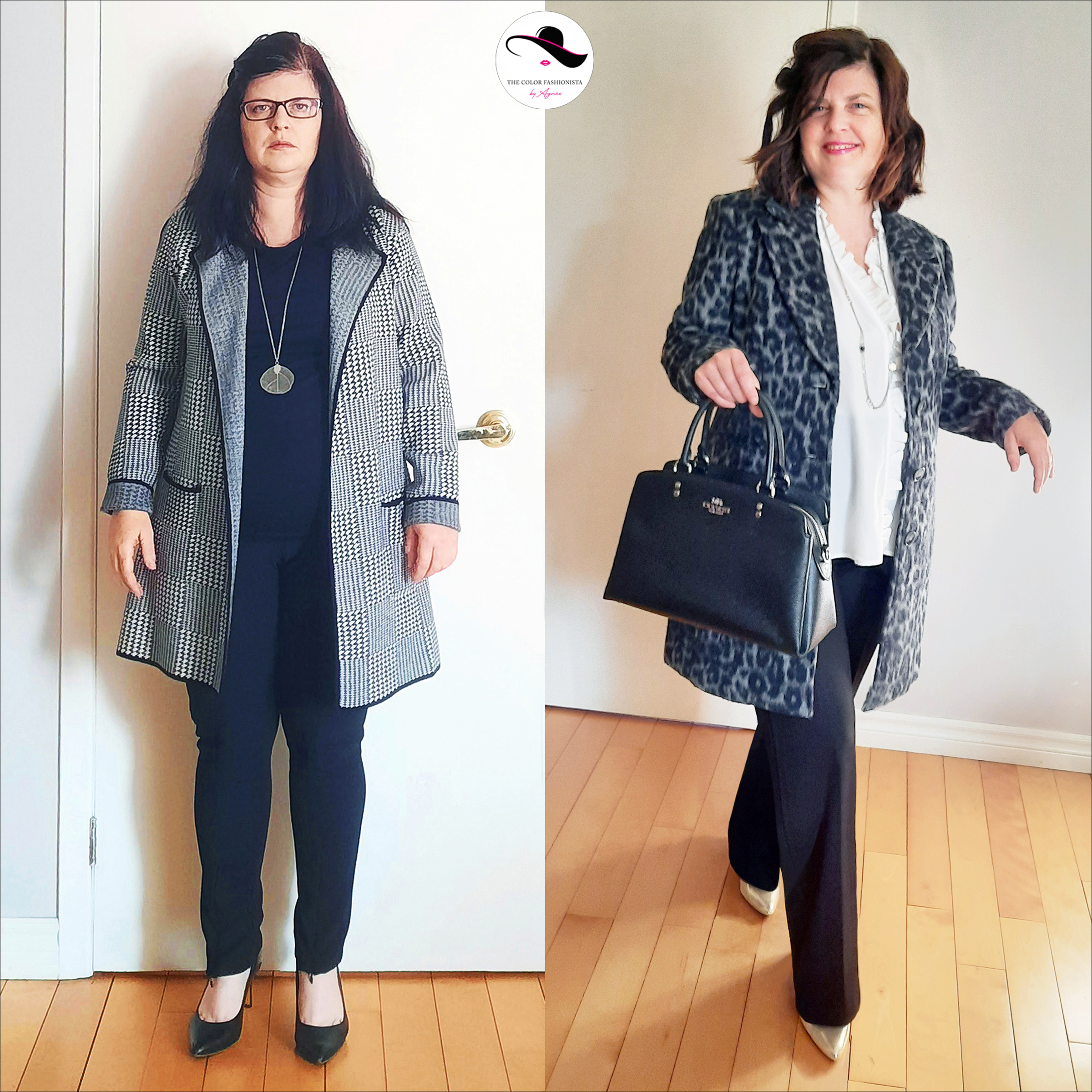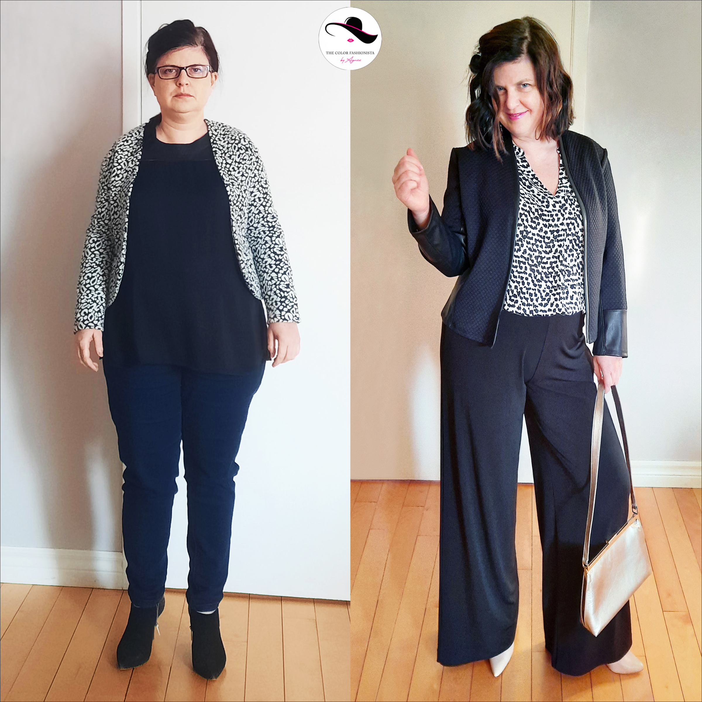 Pour sa morpho A, il est judicieux de porter les motifs sur le haut du corps, donc sur une veste ou une blouse. Pour sa colorimétrie HIVER FROID, j’ai recommandé d’imprimés animaliers en camaïeu de noir et gris qui sont des teintes froides (plutôt que marron et fauve qui sont des tons chauds), et comme ce sont des neutres, ils s’accordent avec tout !