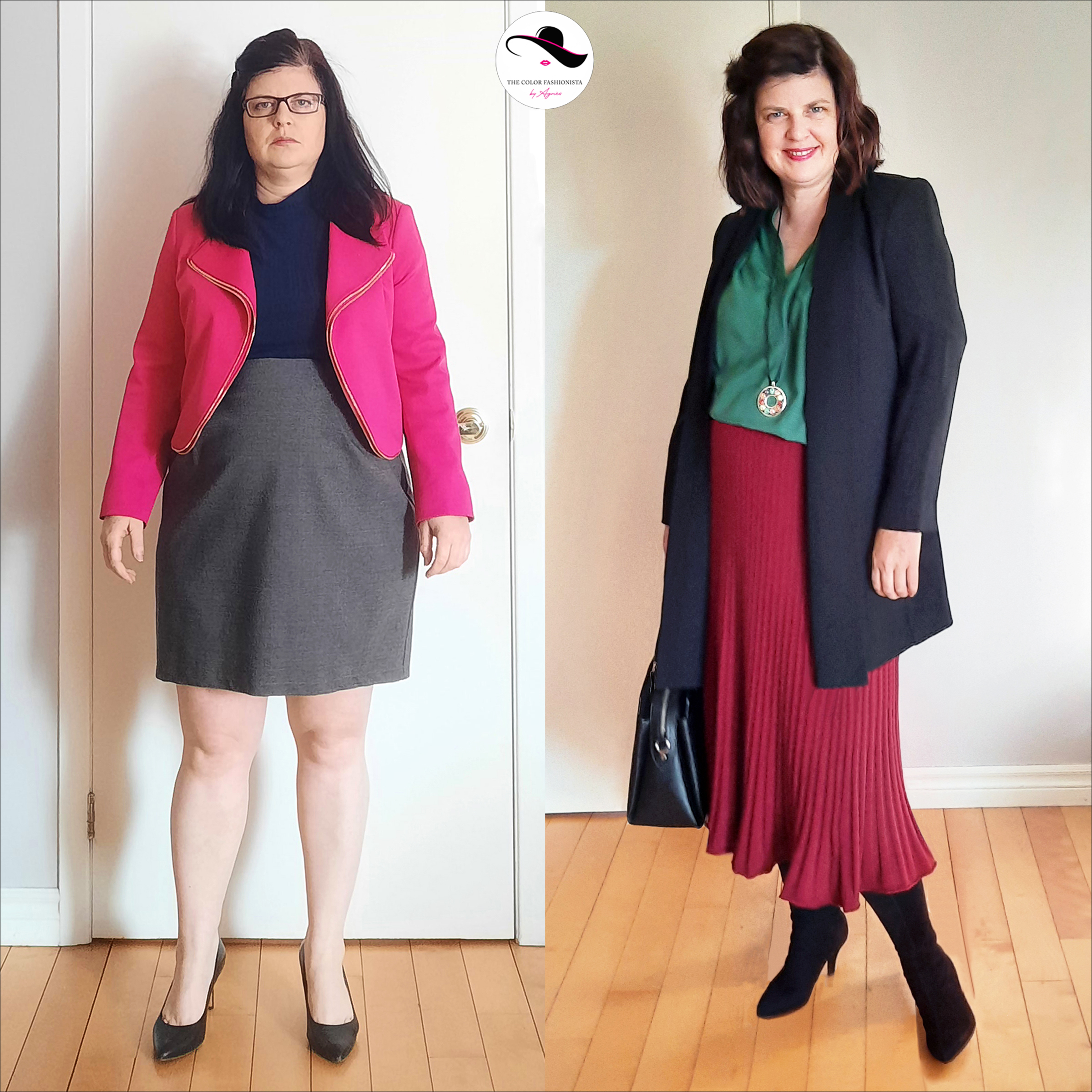 Pour le bureau, je lui ai proposé une silhouette corporate avec principalement des ensembles veste/pantalon. Je trouve ça élégant et féminin car l’aspect tailoring fait justement ressortir la féminité. Un pantalon ou une jupe midi + une veste assortie ou un pantalon noir avec un blazer de couleur. Les vestes doivent être structurées aux épaules et assez longues pour couvrir ses hanches, les pantalons fluides à jambes larges pour équilibrer la largueur de ses hanches, les jupes évasées et fluides (coupe trapèze, corolle, midi).