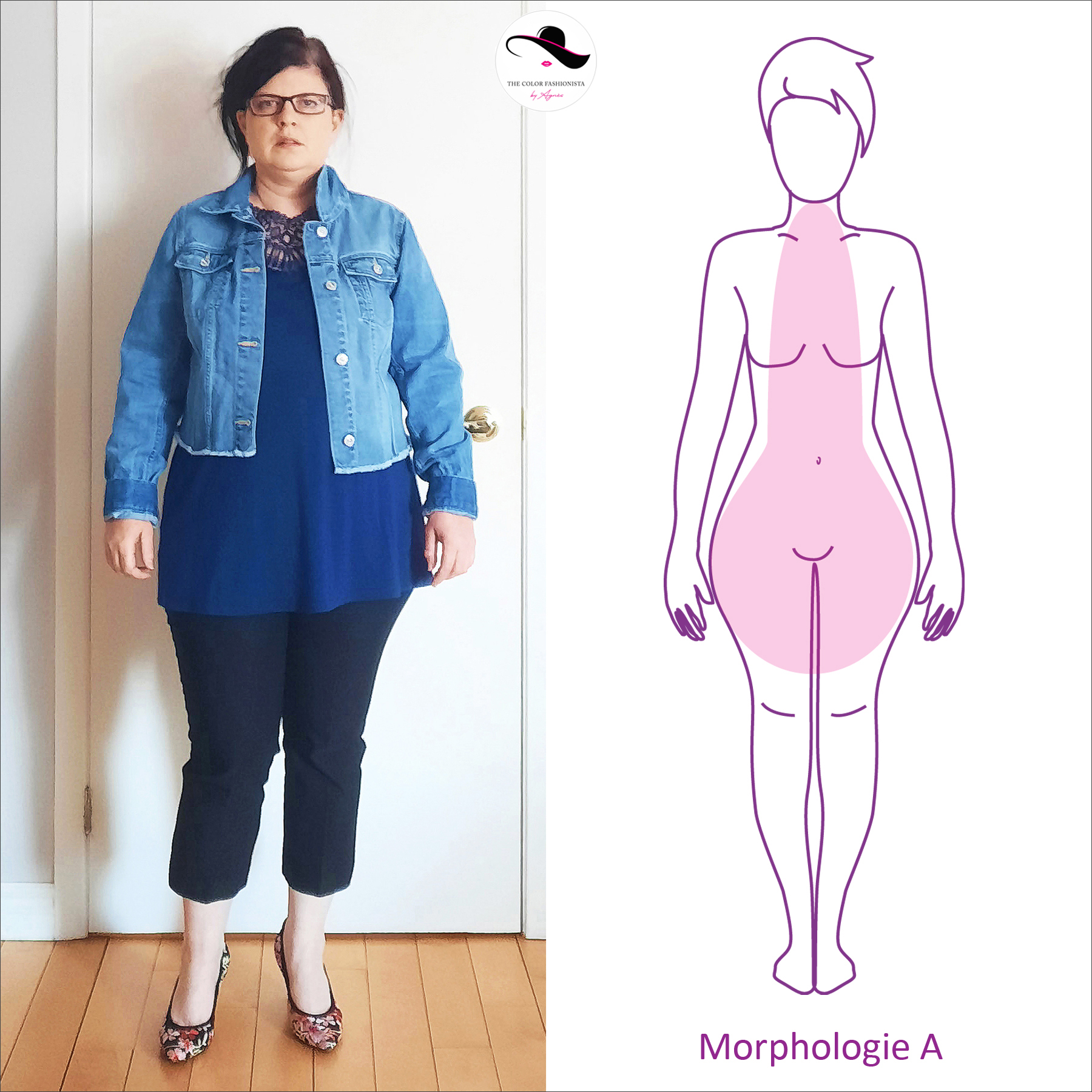 Si on la compare avec la morphologie X considérée comme idéale (épaules et hanches alignées + taille marquée), la morphologie A présente un déséquilibre car le bas du corps est plus large que le haut : Nathalie porte des vestes taille M, des pantalons ou jupes taille L. Il faut donc rééquilibrer sa silhouette : étoffer son buste et ses épaules, affiner sa taille et son bassin, allonger ses jambes. Tout est une question de perception visuelle de la silhouette qui repose principalement sur la bonne utilisation des proportions permettant de tricher par illusion d’optique, pour valoriser ses atouts et minimiser ses éventuels complexes (on en a toutes, n’est-ce pas ? 😉).