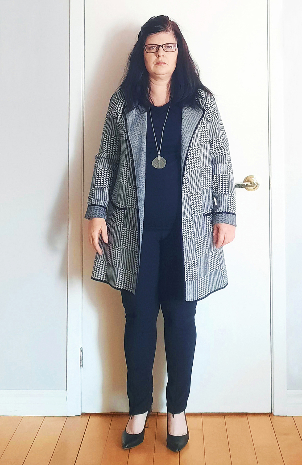 Au-delà du style des tenues qui lui apportent peps et modernité, la silhouette de Nathalie semble affinée : un résultat obtenu grâce à des coupes adaptées, de bonnes proportions et un placement judicieux des couleurs ! Nathalie vivant au Québec, c’est elle qui a réalisé cette session photos avec l’aide de sa fille. Les photos parlent d’elles-mêmes : le sourire radieux, le regard malicieux et les poses décomplexées montrent une aisance et une confiance pleinement exprimées qui font plaisir à voir !