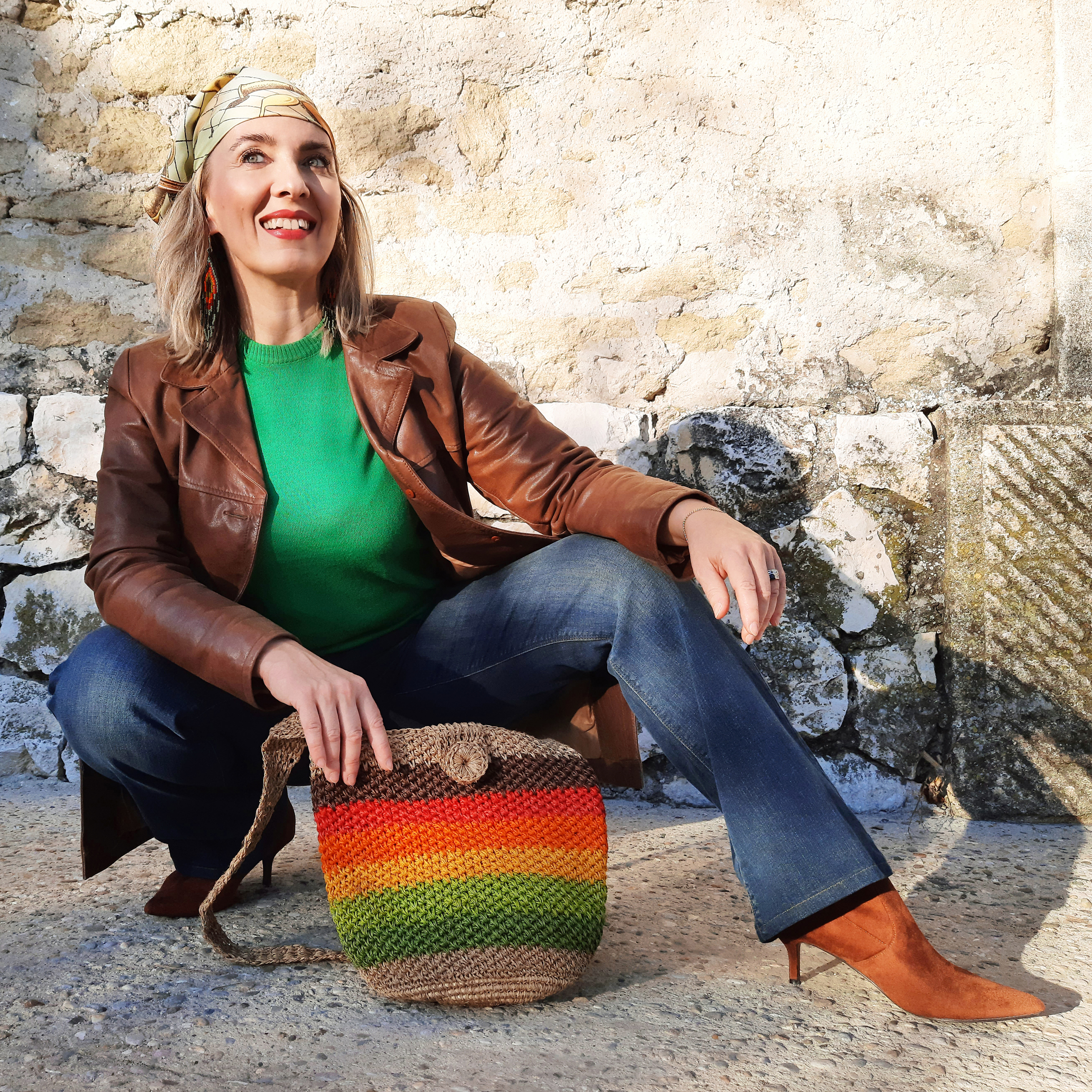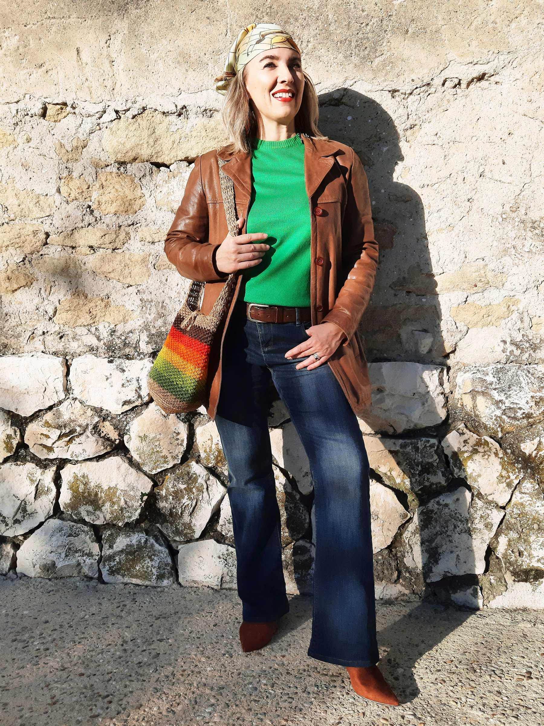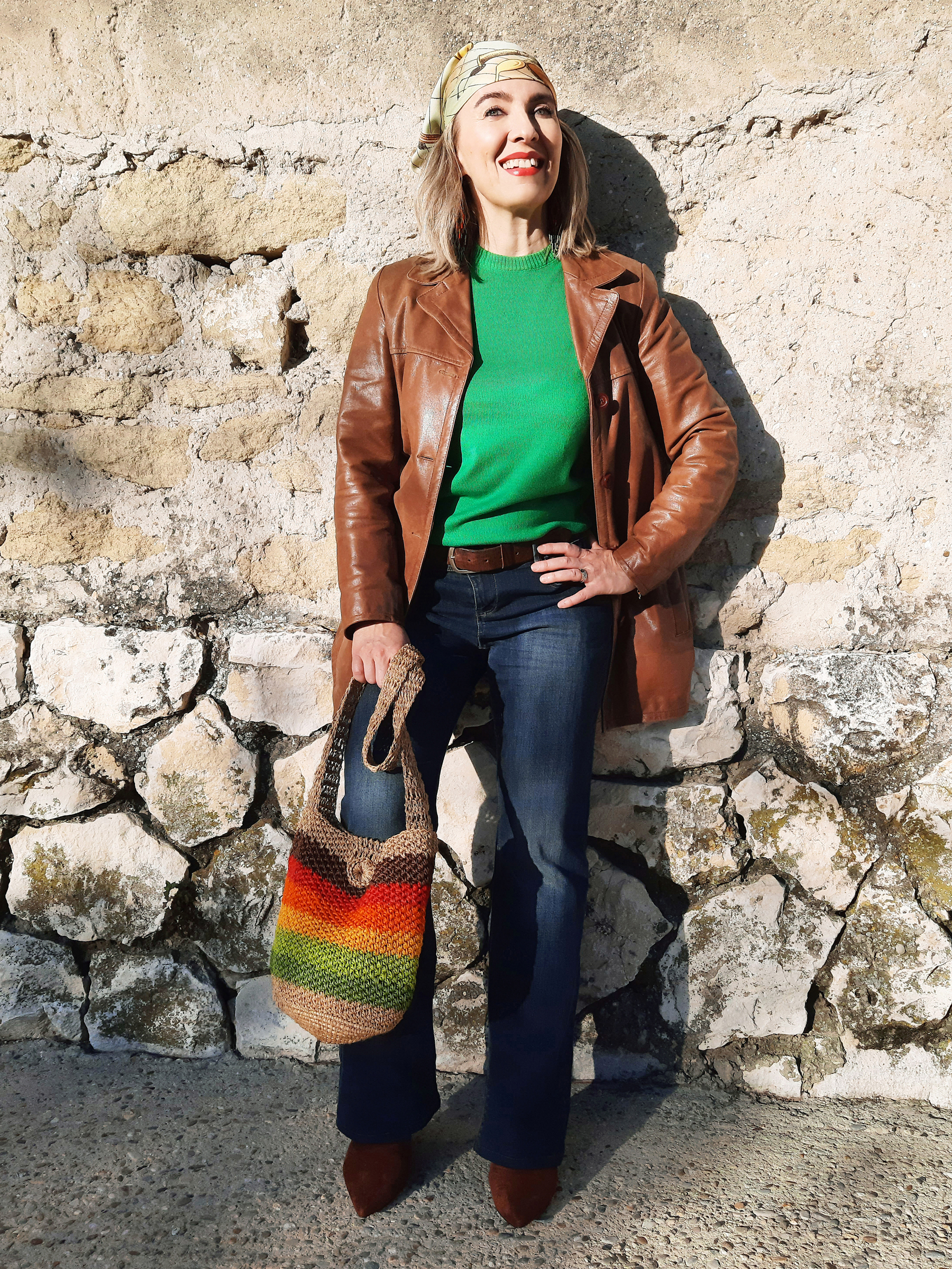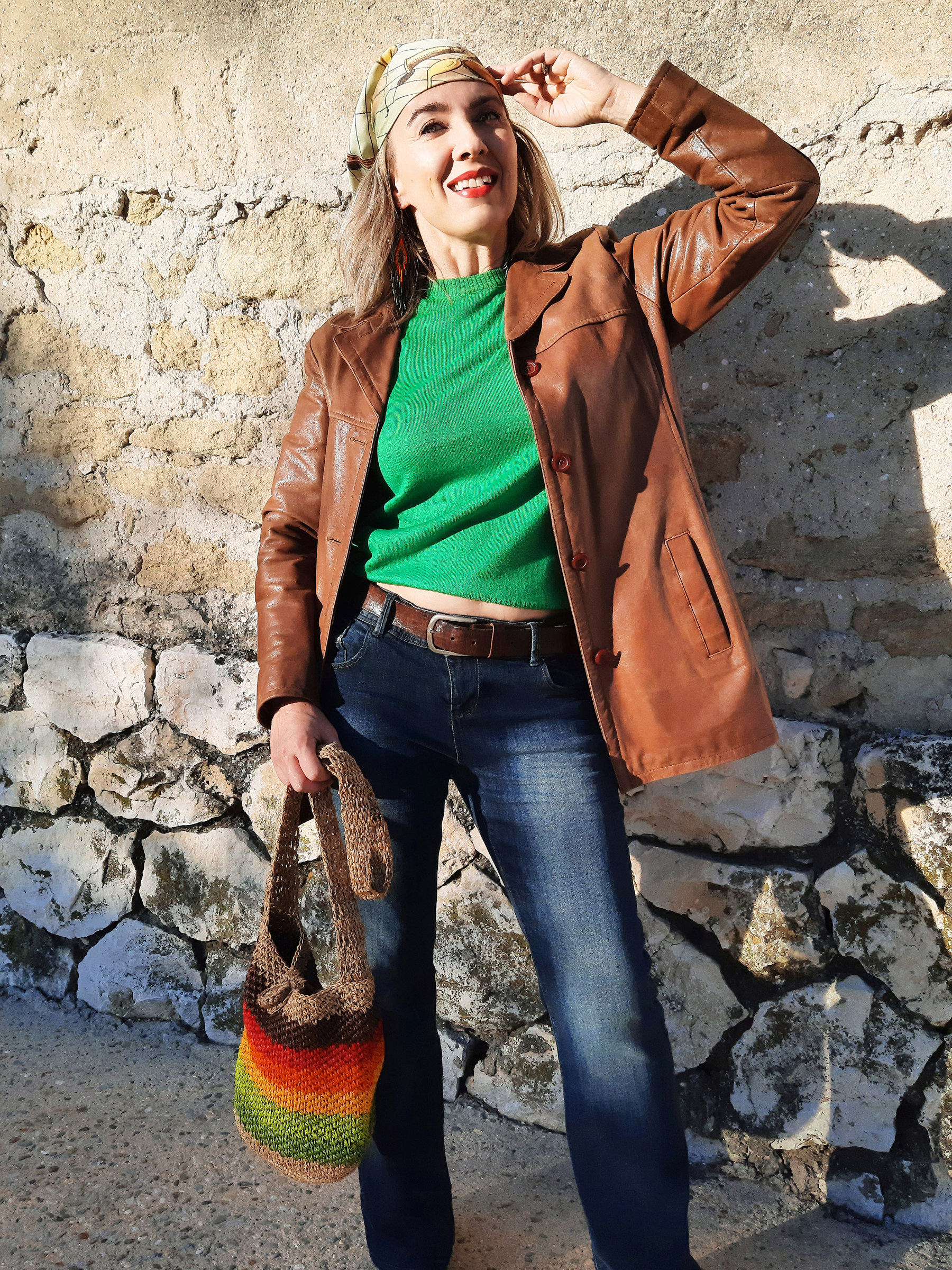 J’ai opté pour un look bohème chic car la tendance hippie ne me correspond pas trop. La base de ma tenue est l’incontournable jeans coupe flare finition brute (plus intemporel que la version pattes d’éph) et la veste en cuir marron typique des 70s, similaire à celle portée par l’acteur David Soul dans la série culte « Starsky & Hutch ». J’ai choisi un combo de couleur très apprécié de la décennie – brun noisette et vert émeraude – à savoir une teinte naturelle chaude associée à une couleur vive froide.