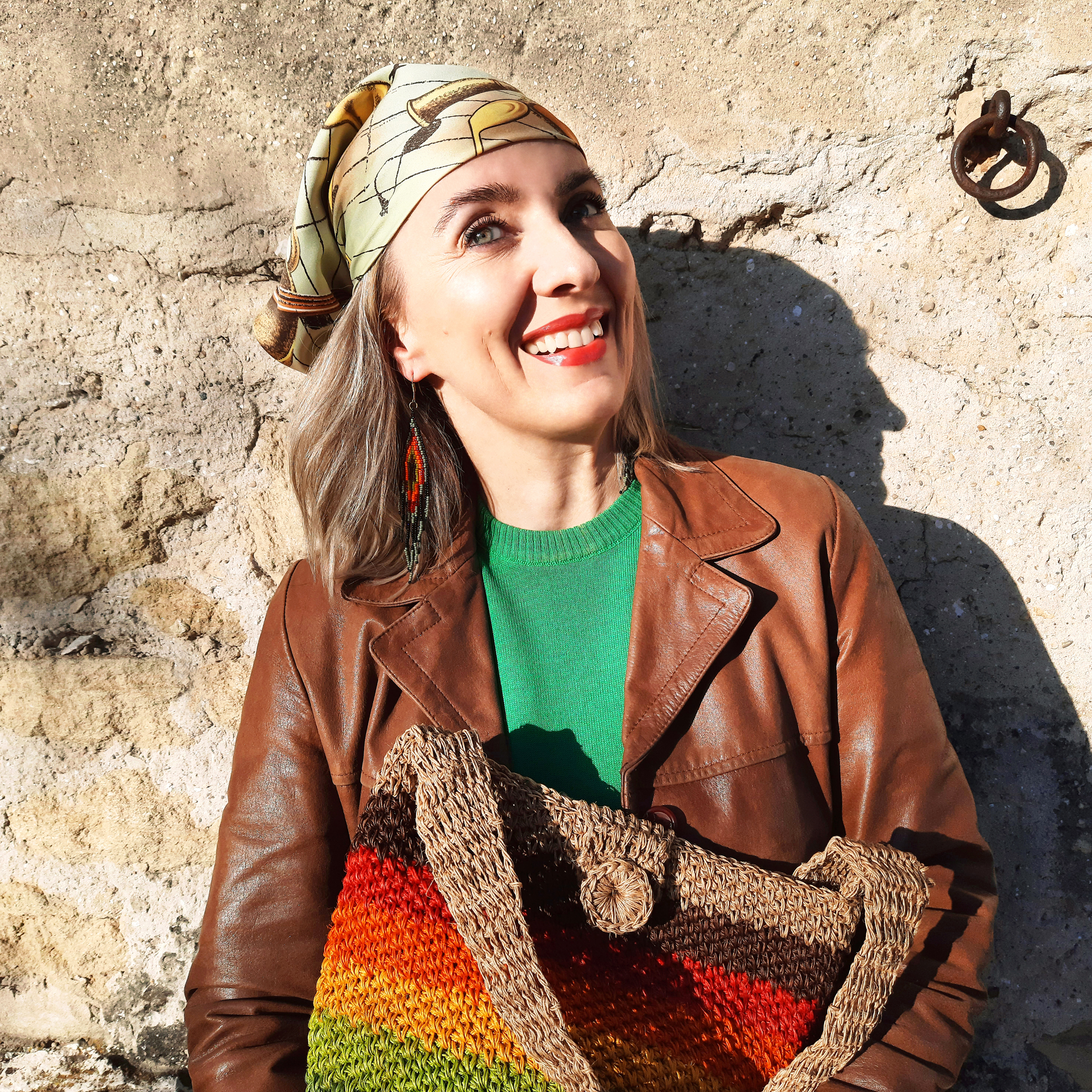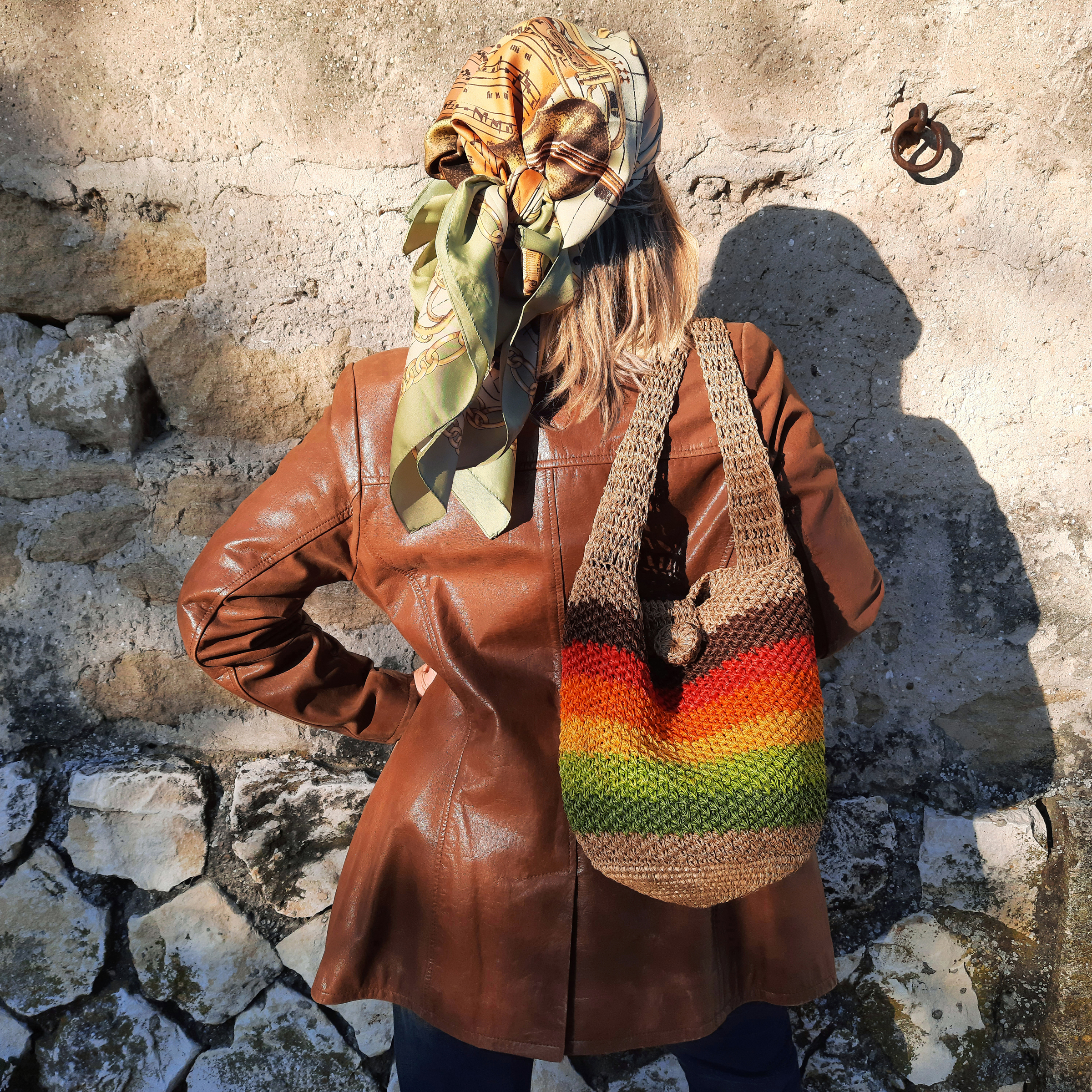 Le choix des accessoires est essentiel pour apporter une connotation rétro à votre look : j’ai choisi cette besace en raphia à longue bandoulière pour son côté rustique dont les bandes en dégradé de couleurs évoquent le drapeau rastafari ou l’arc-en-ciel « Rainbow Family ». Le foulard de tête posé sur le front à la manière d’un turban et négligemment noué sur la nuque est un accessoire très prisé dans les années 70.