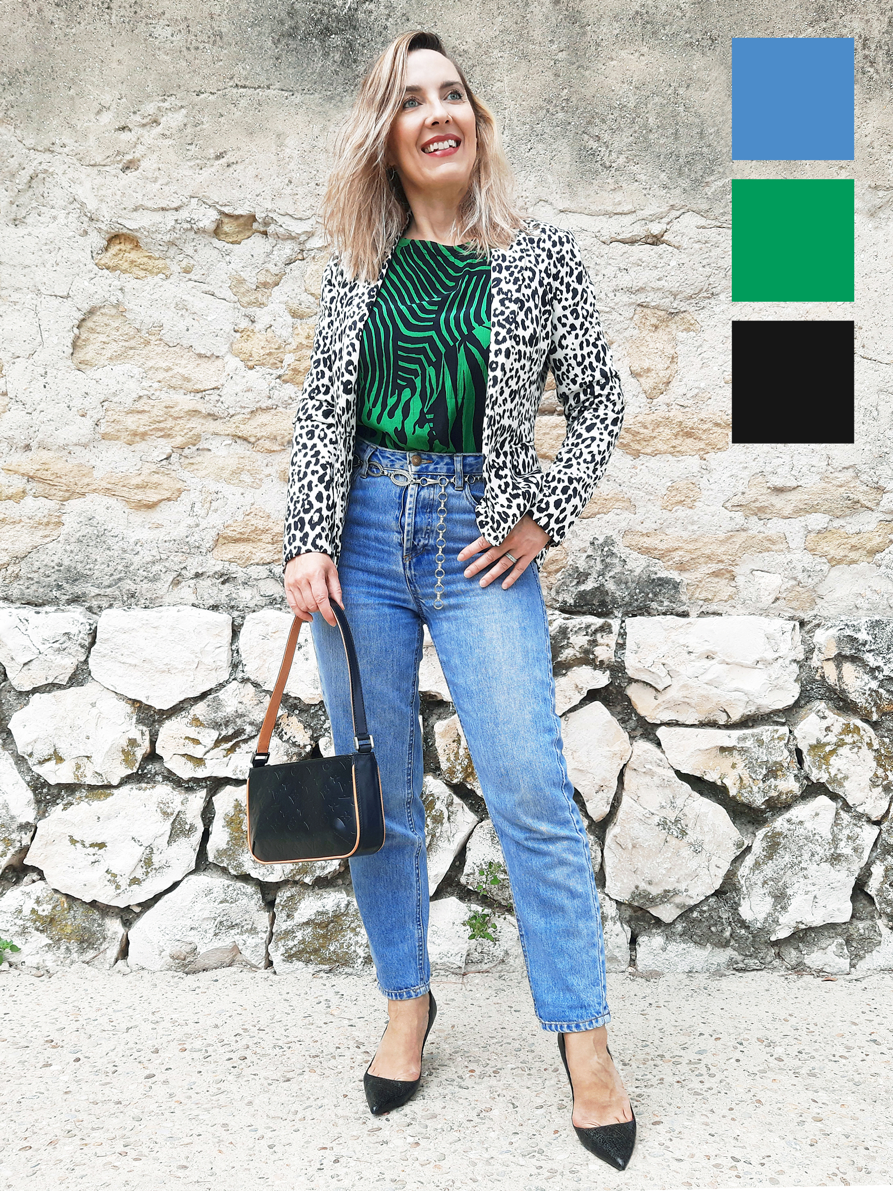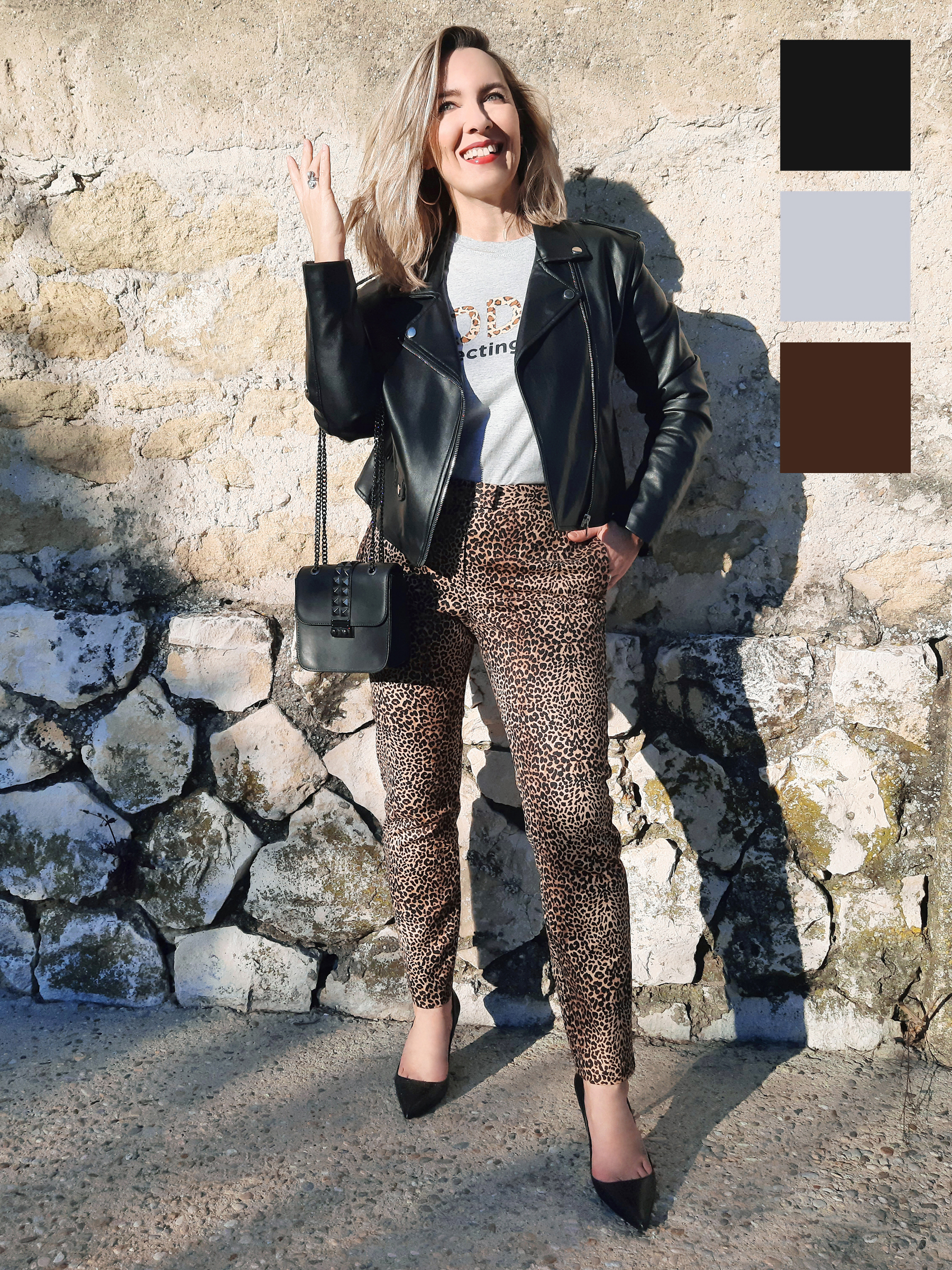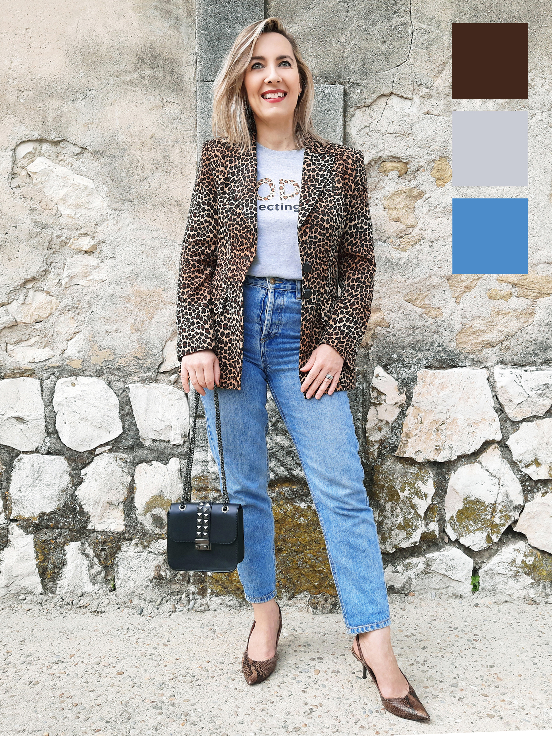 A première vue, cette palette ne semble pas très harmonieuse, mais vous verrez qu’elle me correspond bien et c’est l’essentiel. Comme neutres, j’ai choisi le blanc et le noir. S’il n’est pas recommandé pour ma colorimétrie de femme Eté Froid (du moins près du visage), je porte du noir dans presque tous mes looks en automne-hiver. En basiques, j’ai opté pour le bleu denim (jeans, veste), le gris perle (t-shirt, pull, poncho) et le marron qui représente l’imprimé léopard que je porte très souvent (veste, pantalon, chaussures, sac).