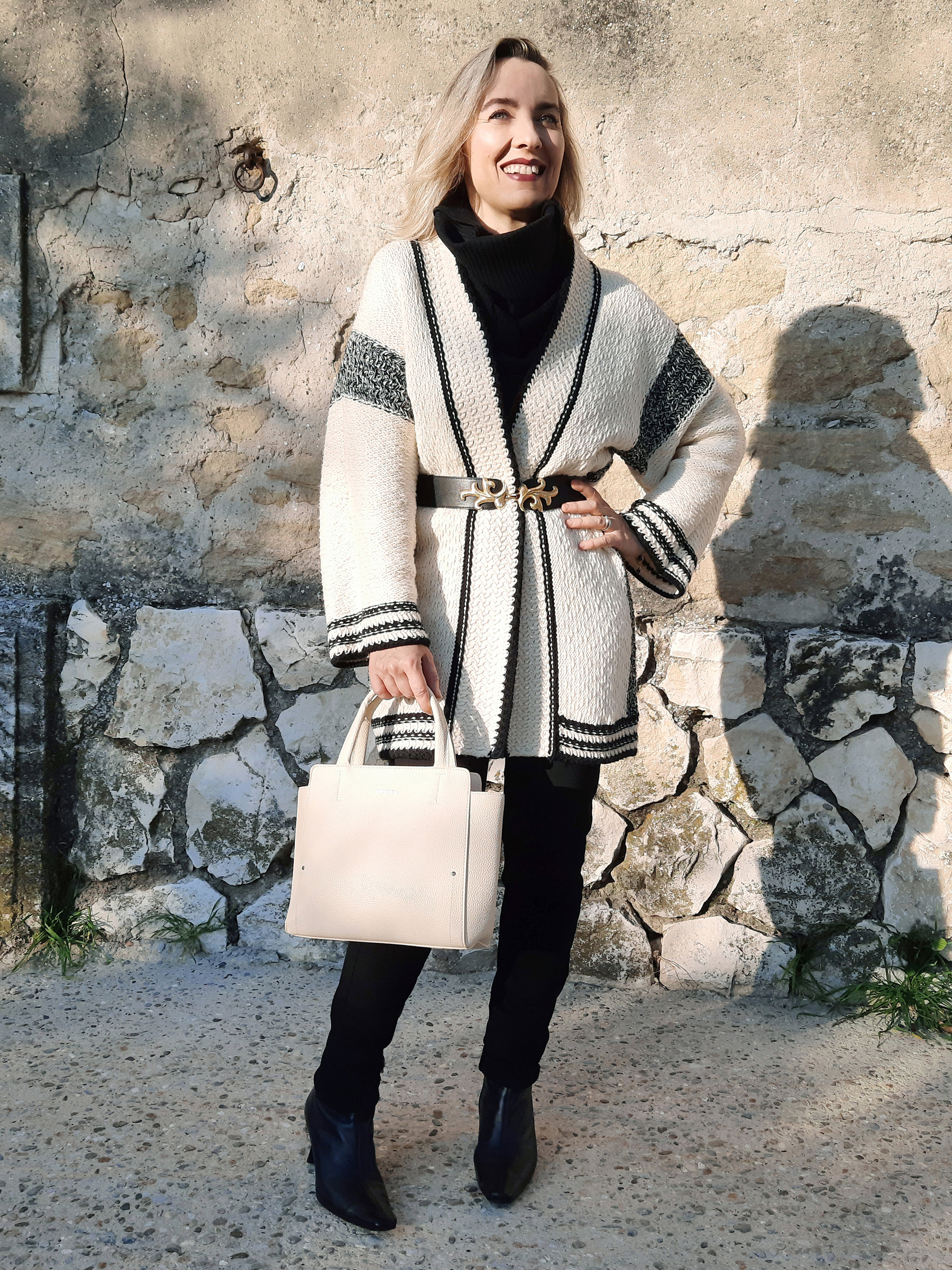 Pour ma garde-robe d’automne (40 pièces) qui devra m’accompagner jusqu’à mi-décembre, je m’orienterai vers des pièces longues comme le trench que je peux porter par dessus mes vestes, des pièces plus chaudes en maille (pull col V, pull col roulé, gilet long) ou ce poncho/plaid très utile qui s’avère être un vêtement à la fois pratique, versatile et aussi chaud qu’une couverture, un joker pour faire la transition vers l’hiver. C’est une des dernières pièces de fast fashion que j’ai achetée fin 2018 et je ne la regrette pas ! Au niveau de ma palette, je vais diminuer les couleurs pour privilégier les gris, noir, blanc et le denim.
