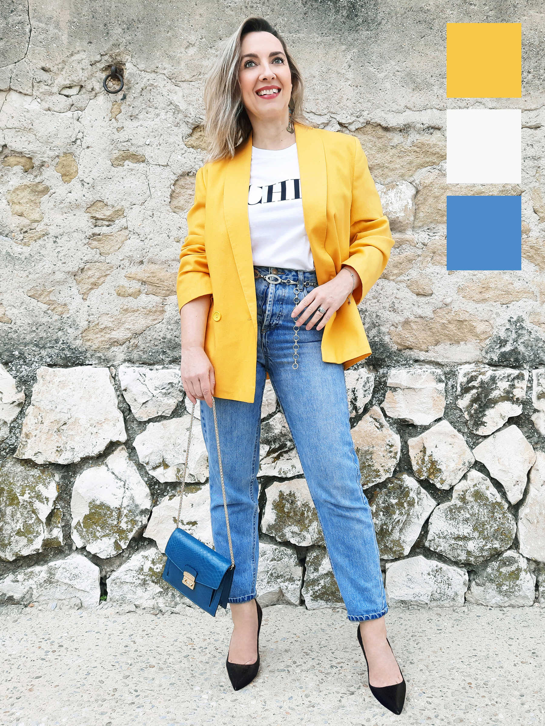 Dans le cadre de la création d’une garde-robe capsule, on vous recommandera de privilégier une palette neutre en vue d’optimiser les associations de pièces – ce qui est très bien si c’est effectivement votre identité vestimentaire – mais je suis d’avis qu’une touche de couleur apportera du peps et un intérêt visuel à votre look. Etant une inconditionnelle des couleurs, je les utilise au quotidien y compris sur des pièces imposantes comme les vestes et les pantalons.