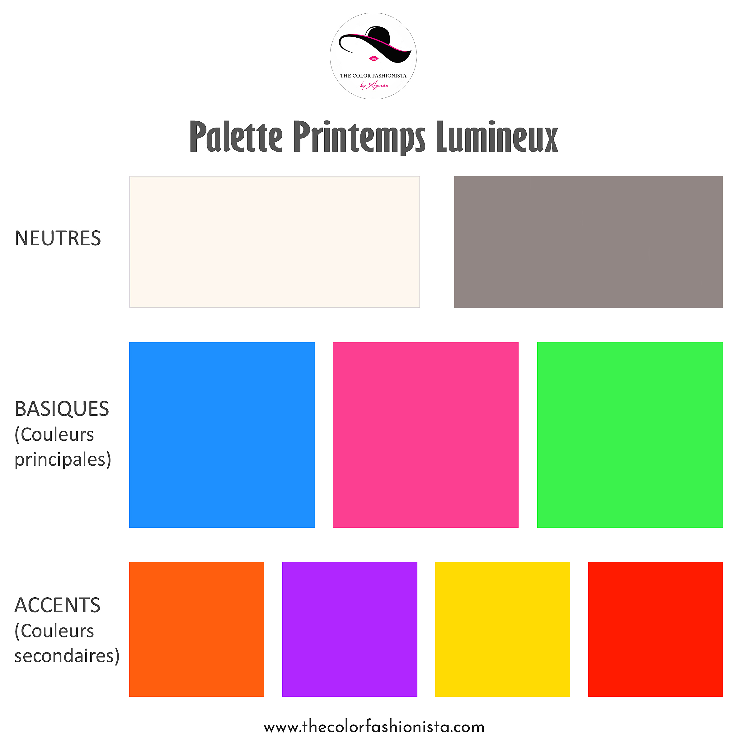 Accents : cyan, vert lime, vert Kelly, tangerine, rouge feu, hot pink, orchidée, violet néon.