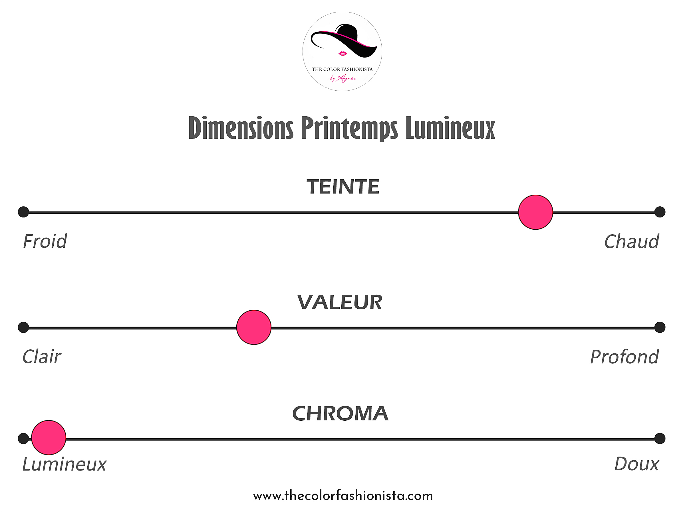 • Teinte (= température) : définit une couleur comme plus ou moins froide (à base de bleu) ou inversement chaude (à base de jaune). Le PRINTEMPS LUMINEUX tend vers l’extrémité chaude du curseur mais il n’est pas complètement chaud à cause de l’influence de l’hiver qui le refroidit : les jaunes, oranges et roses sont très présents, ainsi qu’une large gamme de verts aussi bien froids (verts bleutés) que chauds (verts jaunes); les bleus contiennent souvent des pigments jaunes et sont à dominante chaude (= turquoise).