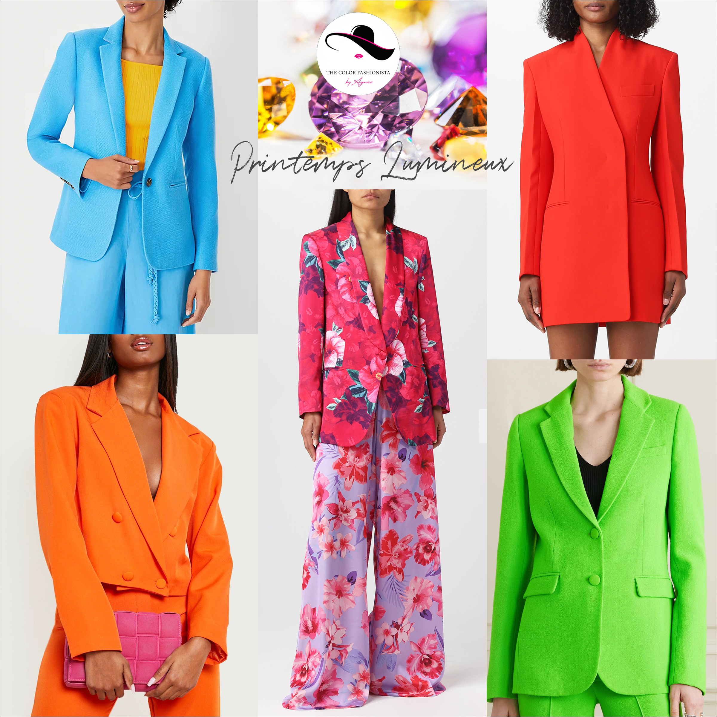 Afin de complémenter au mieux sa colorimétrie intense, la femme PRINTEMPS LUMINEUX doit opter pour des looks saturés et très colorés. Les camaïeux, les tenues nude ou entièrement à base de neutres sont à éviter car elles s’avèrent trop fades, de même que le monochrome sauf s’il présente un contraste de valeur suffisant (bleu Capri + bleu cobalt). Possédant des caractéristiques neutres-chaudes, le PRINTEMPS LUMINEUX peut mixer des teintes chaudes avec les nuances les plus fraîches de sa palette. Si le noir est autorisé, il est recommandé en petite quantité et à mixer avec une couleur vive, chaude de préférence.