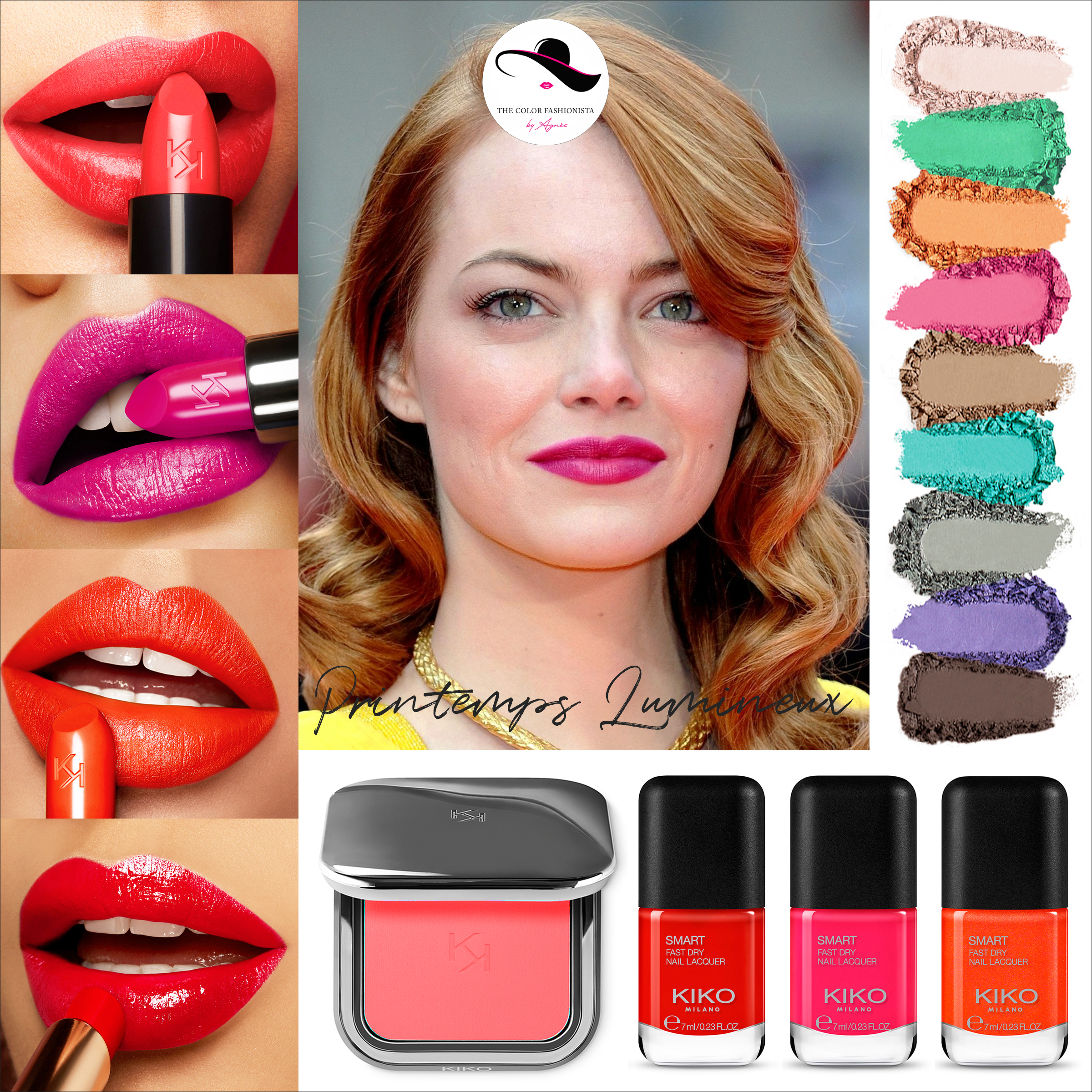 La femme PRINTEMPS LUMINEUX privilégie une mise en beauté vibrante, naturelle et fraîche. Elle est sublimée par les couleurs à base de pigments pêche comme le corail, l’orange, les roses et rouges orangés. Elle doit éviter les nuances bleutées ou dorées qui ne s’accordent pas avec sa coloration neutre-chaude : les blush saumon, pêche et corail sont les plus adaptés, mais la poudre bronzante et un contouring trop appuyé sont à éviter au profit d’un illuminateur.