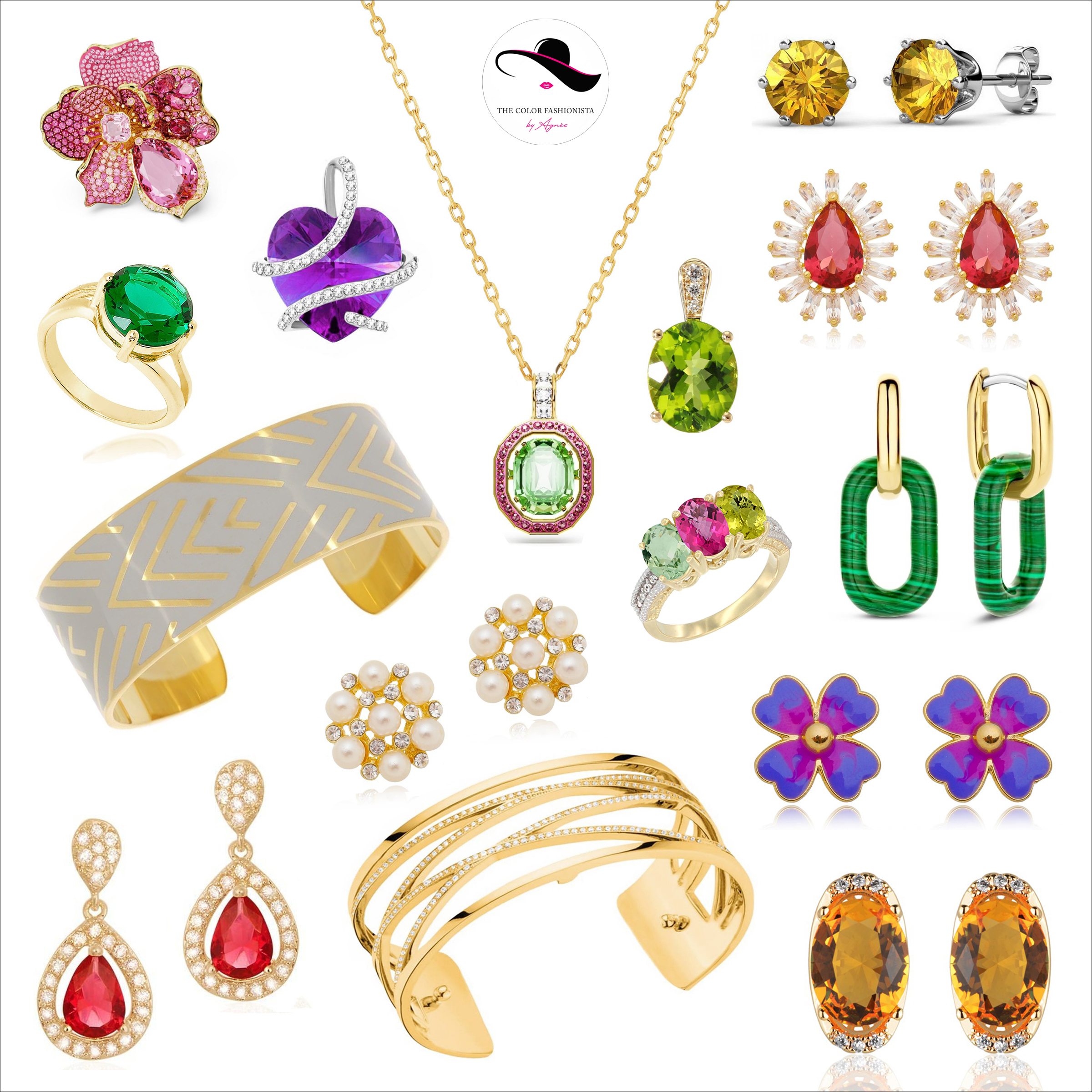 Pierres : héliodore, béryl jaune, citrine, péridot, opale, turquoise, malachite, topaze (bleue ou rose), tanzanite, spinelle (rouge ou rose), tourmaline, améthyste, rubis, émeraude, perles de culture (blanche, crème ou rose), diamant, cristaux Swarovski.