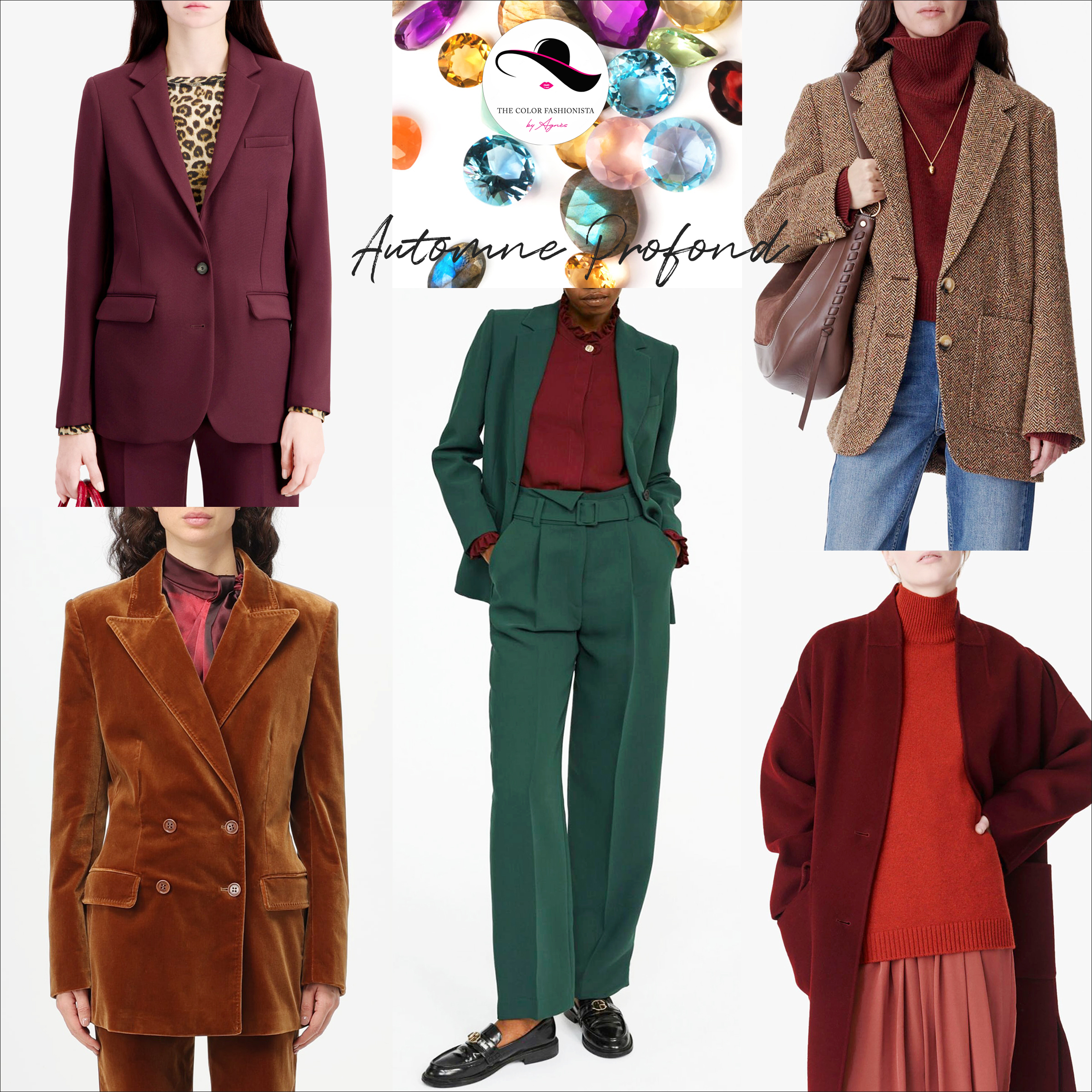 La palette de l’AUTOMNE PROFOND est riche mais l’ajout de noir pondère son éclat : elles est dominée par des teintes chatoyantes et denses à base de marron, rouge et pourpre – comme le bronze, acajou, paprika, bourgogne et violine. Malgré son contraste élevé, l’AUTOMNE PROFOND n’est pas valorisé par le noir pur (un neutre à dominante froide) : le chocolat noir et l’aubergine seront de meilleures alternatives, plus flatteuses pour le teint. Le blanc est à exclure, trop agressif et contrasté pour cette saison amortie.