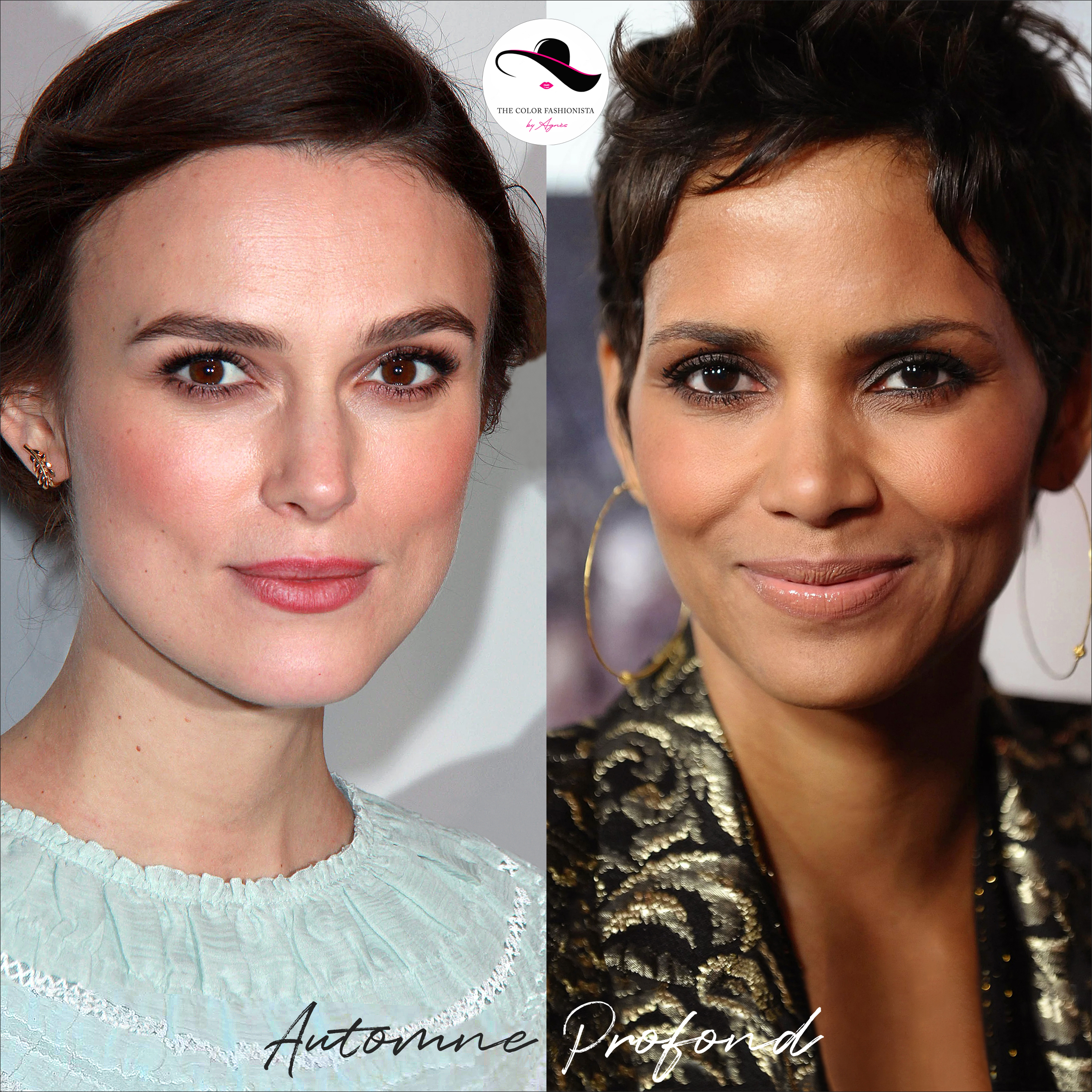Note : la femme AUTOMNE PROFOND est de deux types. D’une part, des yeux et cheveux foncés (brun, marron, noir) contrastant avec une peau très claire ; d’autre part, des caractéristiques entièrement sombres (yeux marron, cheveux noirs, peau noire) contrastant avec un blanc de l’œil vif et des dents éclatantes.