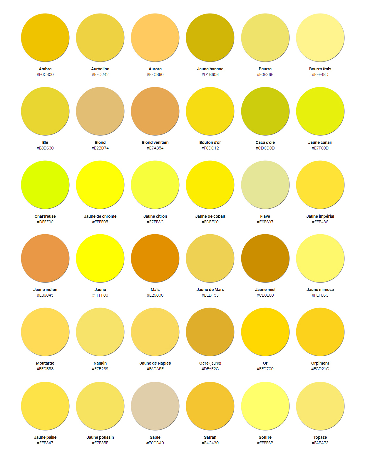 Palette : crème, champagne, vanille, jaune pastel, jaune beurre, beurre frais, lemon chiffon, jaune sorbet, jaune topaze, jaune poussin, jaune paille, jaune flave, jaune soufre, jaune mimosa, jaune citron.