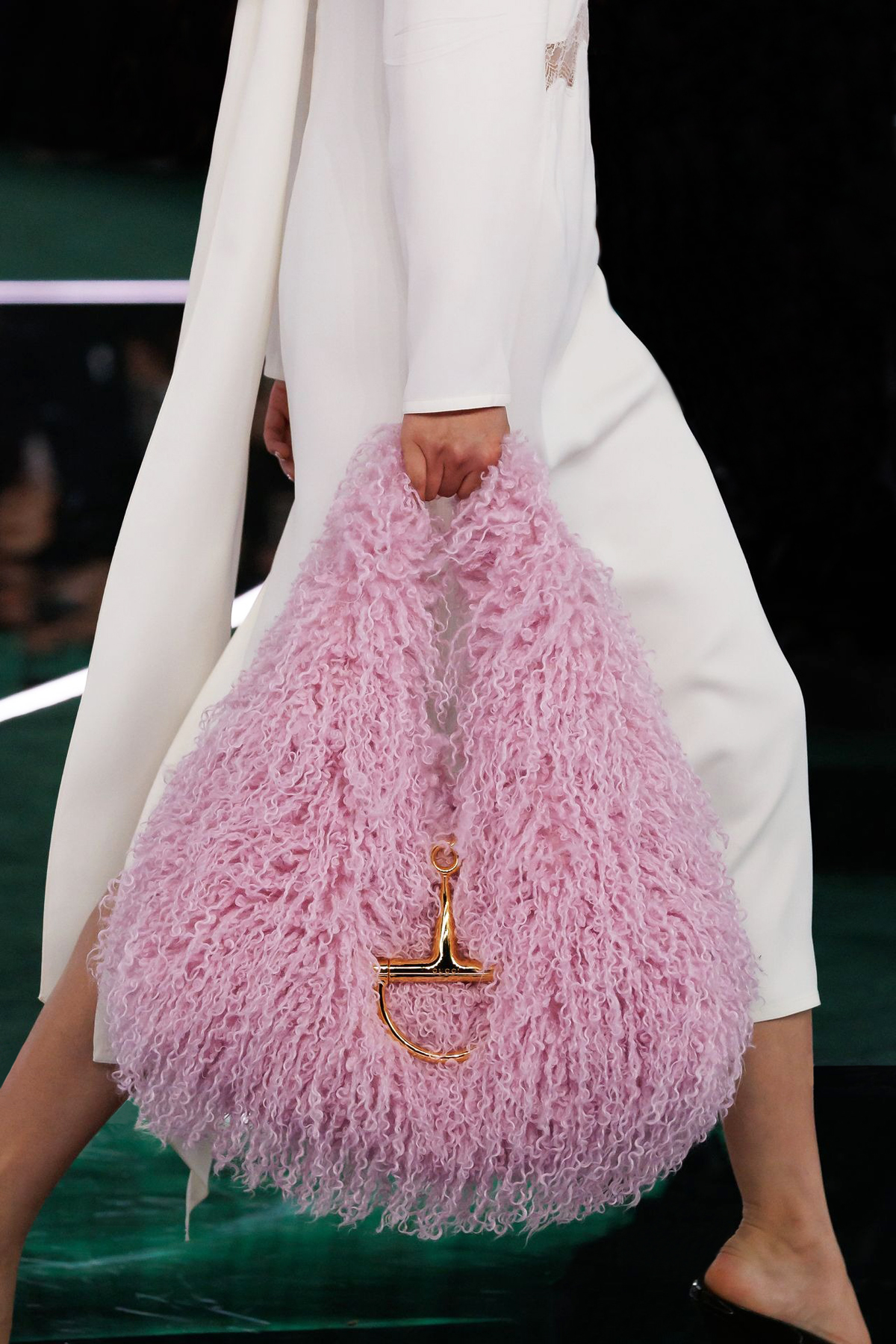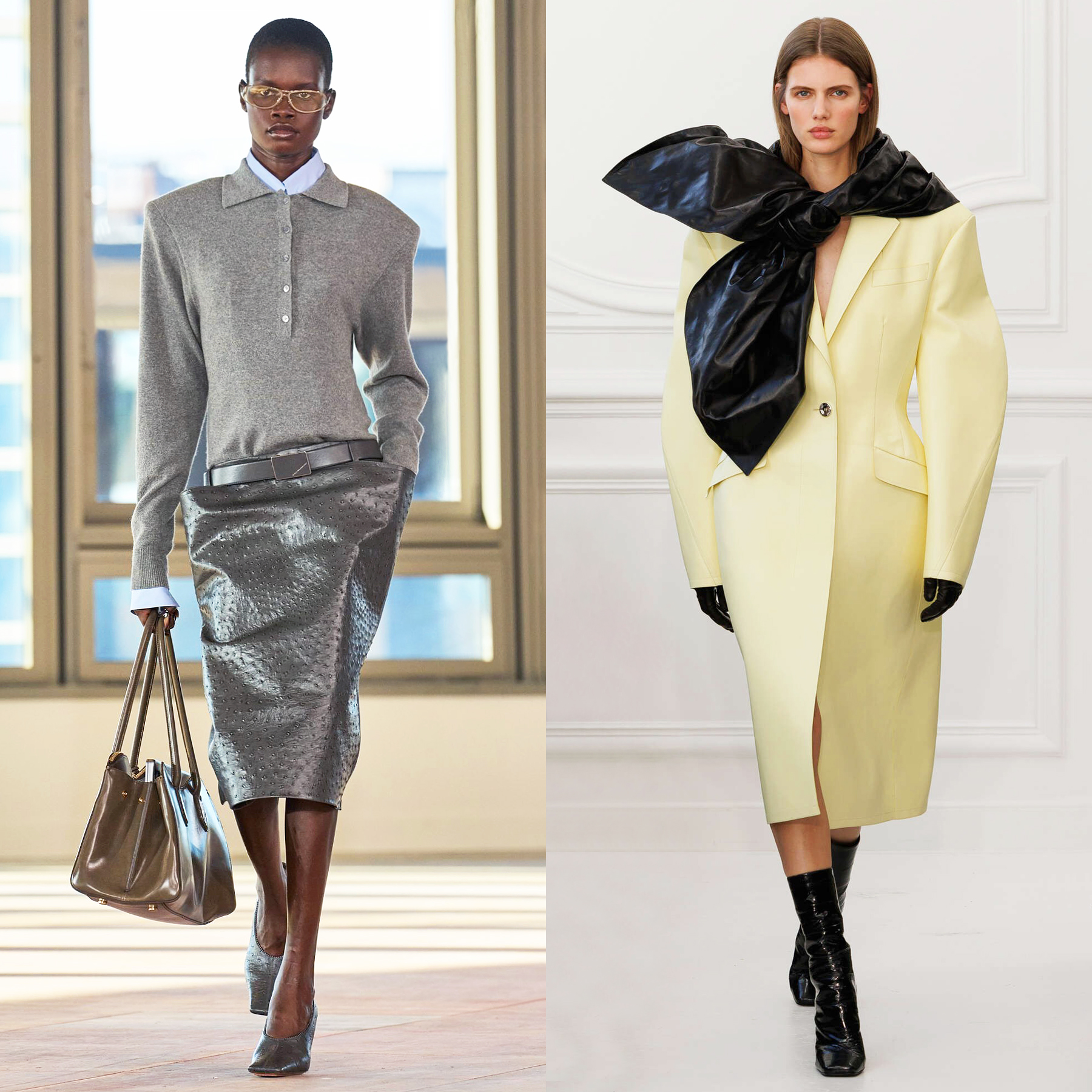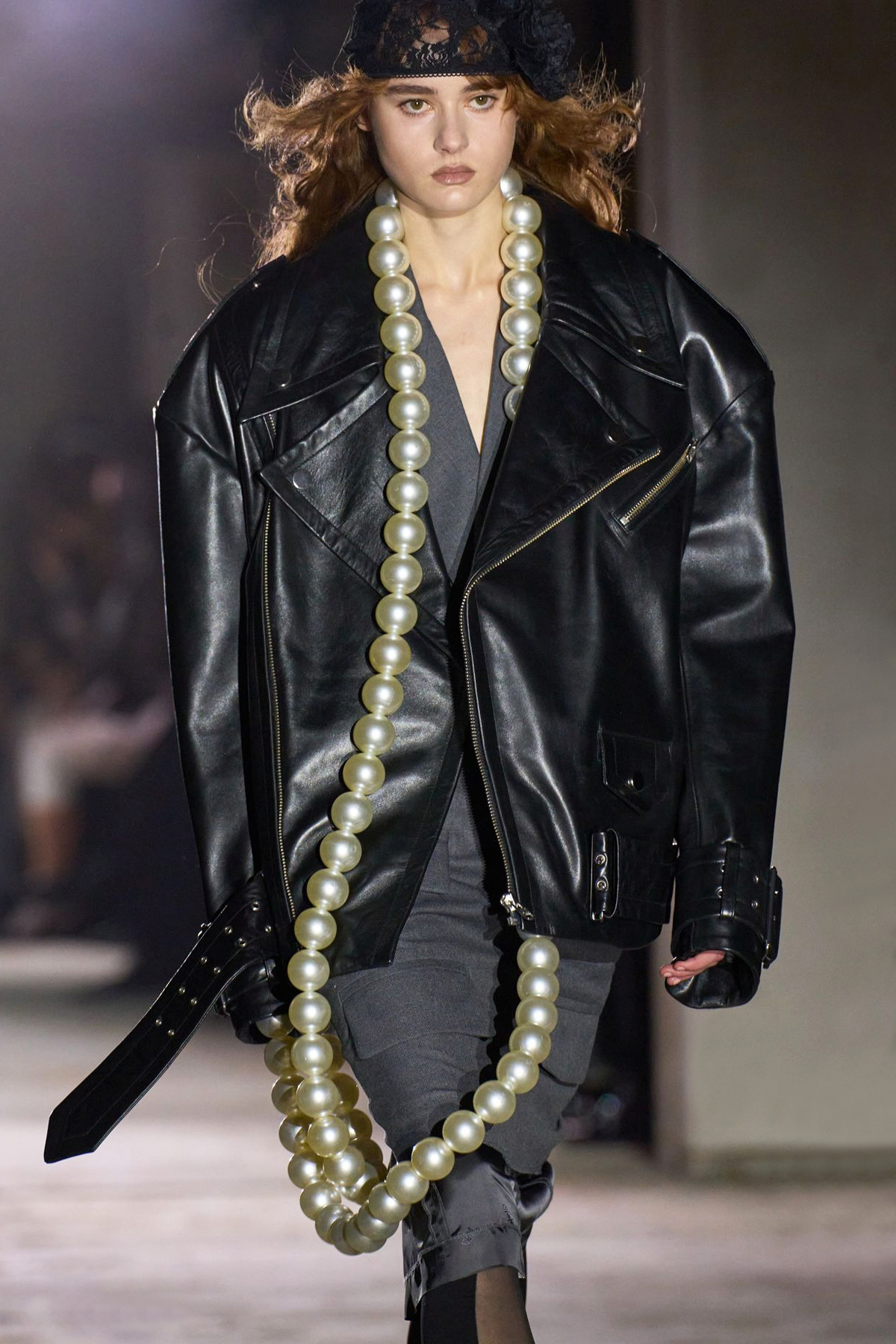 Acne Studios prône la démesure en ornant ses pulls d’un nœud gigantesque en laine bouillie ou d’une étole crossbody intégrée recouvrant l’ensemble du buste. Chez Givenchy, un manteau minimaliste jaune pastel est souligné d’un foulard surdimensionné en cuir noir au rendu saisissant. Côté bijoux, Chanel détourne ses colliers de perles en version XXL pour en faire des mini-sacs portés en bandoulière, dont la grosse perle centrale fait office de réticule. Enfin, mention spéciale pour les sautoirs ultra-longs en perles géantes qui tombent jusqu’au sol, vus chez la marque new-yorkaise Vaquera.