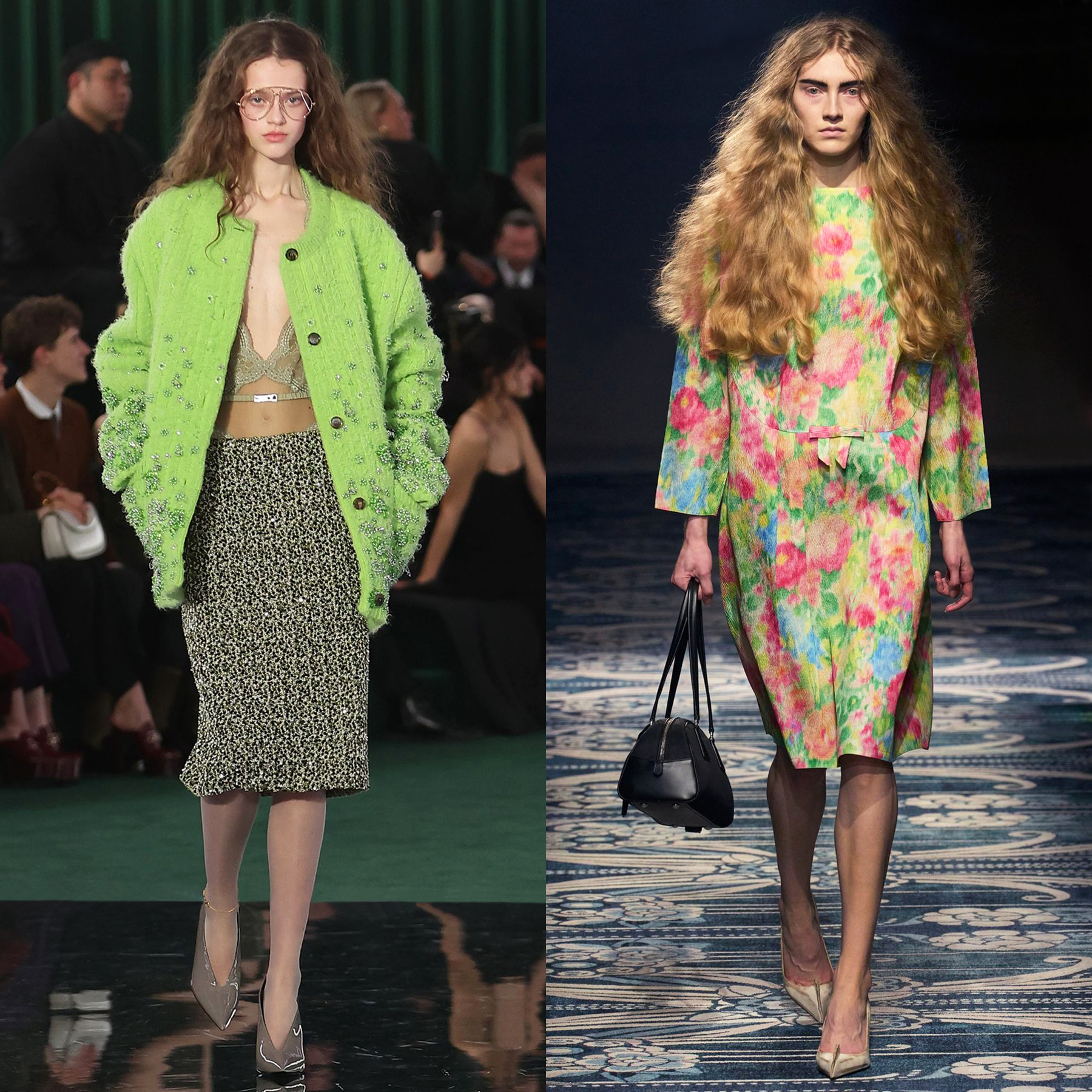 Les teintes pastel (pêche, rose dragée, bleu layette, vert d’eau) restent une tendance forte pour apporter de la douceur dans la froidure hivernale, repérées chez Gucci, Chanel. Concernant les associations, on retiendra le dynamisme du color-block (Saint-Laurent, Miu Miu, Gucci), la sobriété du monochrome (Carolina Herrera, Max Mara, Victoria Beckham), l’intemporel combo noir et blanc (Givenchy, Chanel, Christian Dior, Richard Quinn) et le look bicolore (gris, camel, chocolat + couleur).