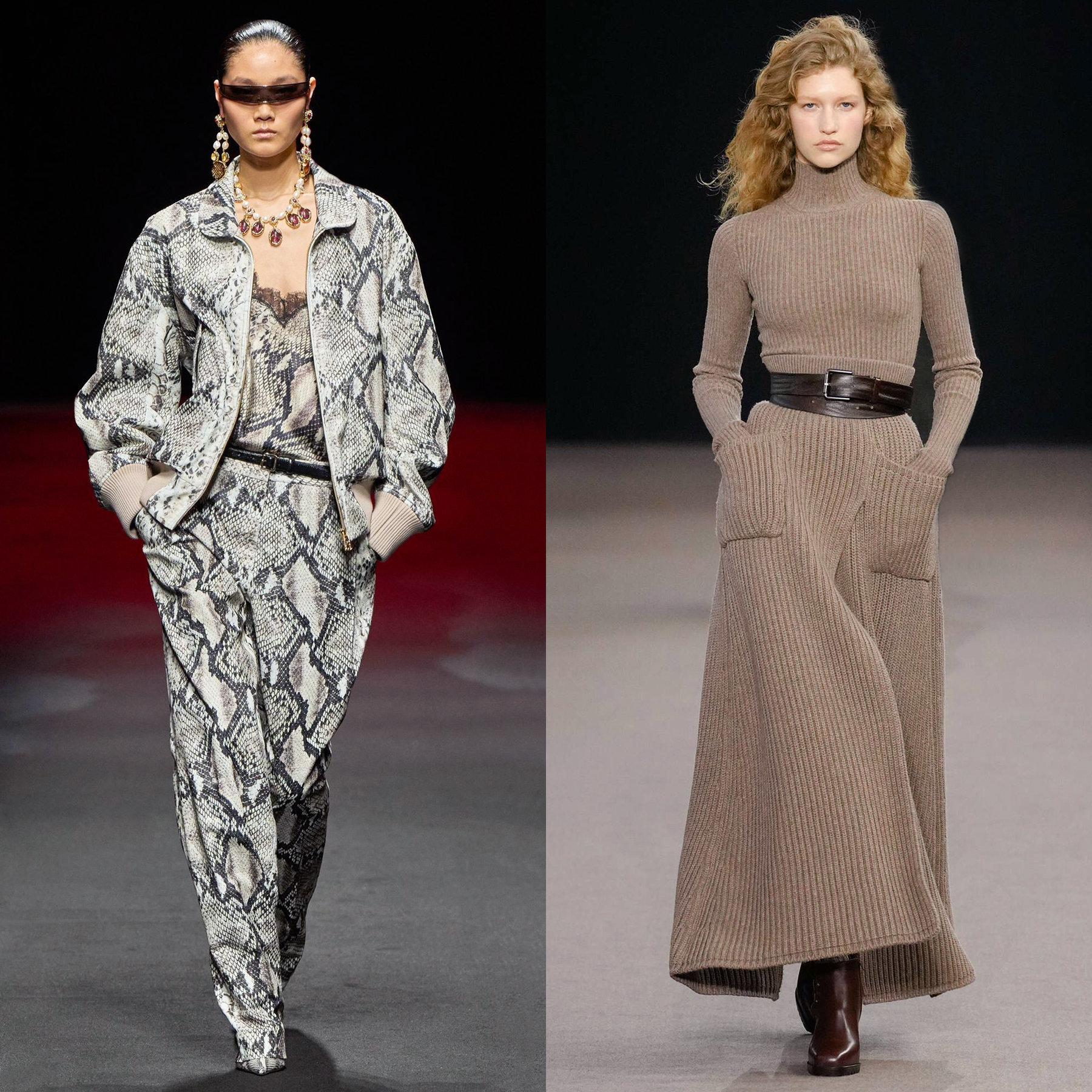 Matière cocooning par excellence, la maille et le tricot – alternative artisanale ou faite main – font également leur grand retour. On a toutes un pull doudou chez soi ou une robe-pull fétiche qu’on reporte année après année (c’est mon cas !). Les créateurs s’approprient le genre en déclinant pulls, cardigans, tuniques, maxi-robes, ensembles coordonnés ou le combo pull + jupe longue assortie. Toutes les techniques de maille sont mises à profit : maille jersey (lisse et douce), maille côte (aspect rainuré), maille Milano (élégante et robuste), maille torsade (texturée ou en relief), etc… Le monochrome est de rigueur et les teintes neutres dominent (gris, camel, taupe, chocolat).