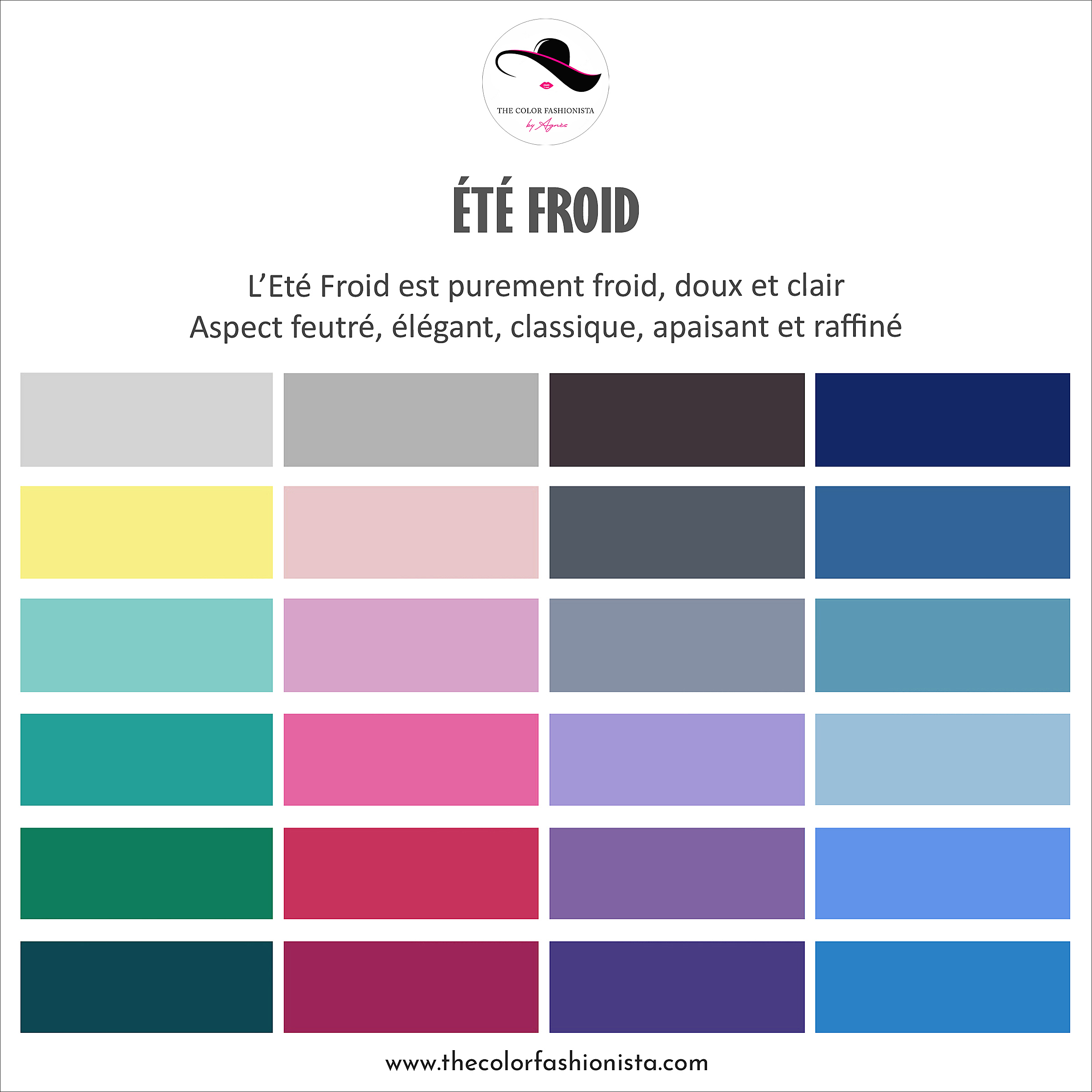 Alliant froideur et douceur, la palette de l’ÉTÉ FROID comprend des couleurs à base de pigments bleus ou gris évoquant les profondeurs marines comme les bleus et verts aquatiques, turquoises, vert-gris, bleu-gris, sans oublier les lavandes et roses poudrés. Si les couleurs de valeur moyenne dominent, la gamme va du clair au sombre, les nuances les plus foncées étant le bleu marine et le gris anthracite. Si les teintes extrêmement profondes sont absentes, on trouve des bleus, verts et violets plus francs qui servent de couleurs accents pour associer aux nuances claires ou pastel.